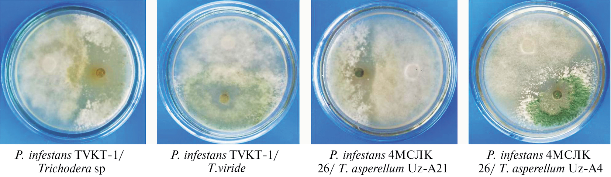 Целью данного исследования было изучение антагонистического потенциала выделенных авторами на территории Узбекистана штаммов грибов рода Trichoderma и бактерий родов Bacillus и Pseudomonas в отношении Ph. infestans для отбора наиболее активных штаммов-антагонистов.