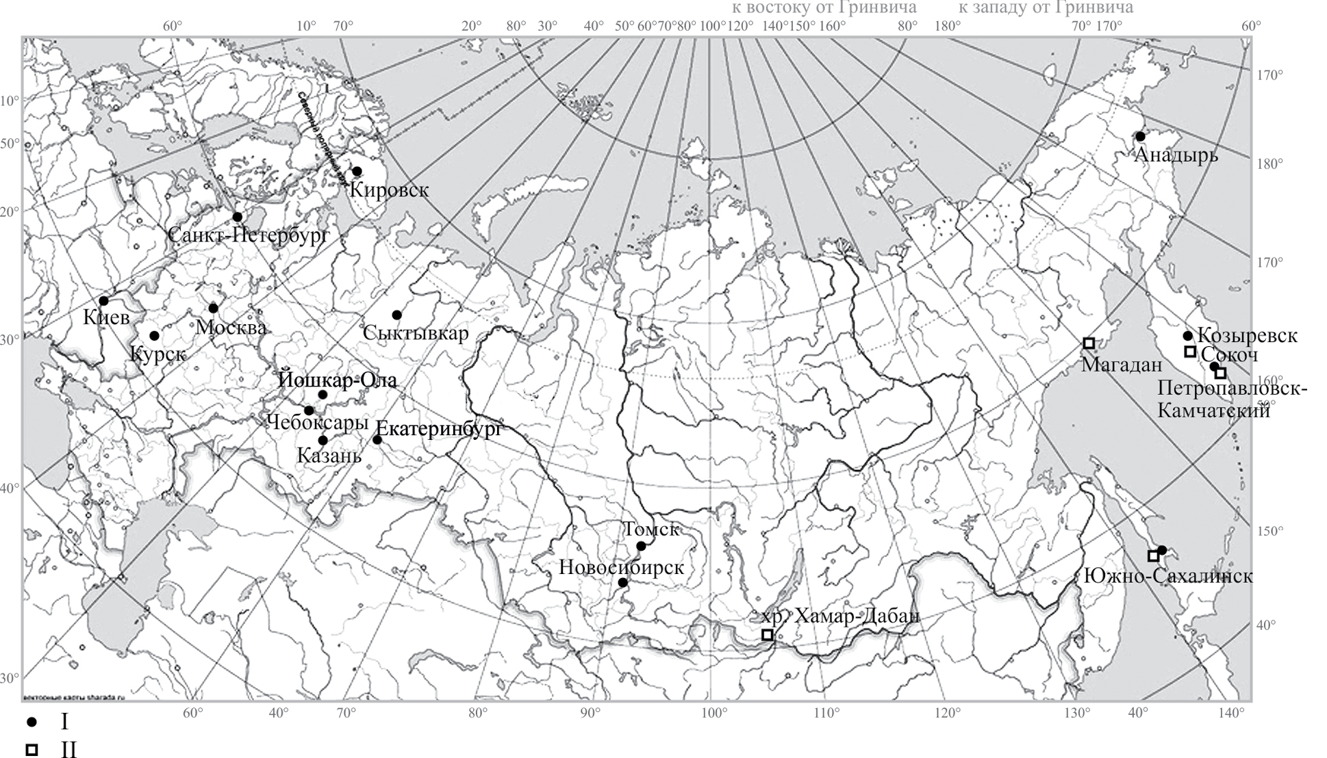Рис. 1. Отмеченные по результатам экспедиций по России изоляты “Typhula ishikariensis species 1” (I) и “T. ishikariensis species 2” (II) (по: Matsumoto, 1997).