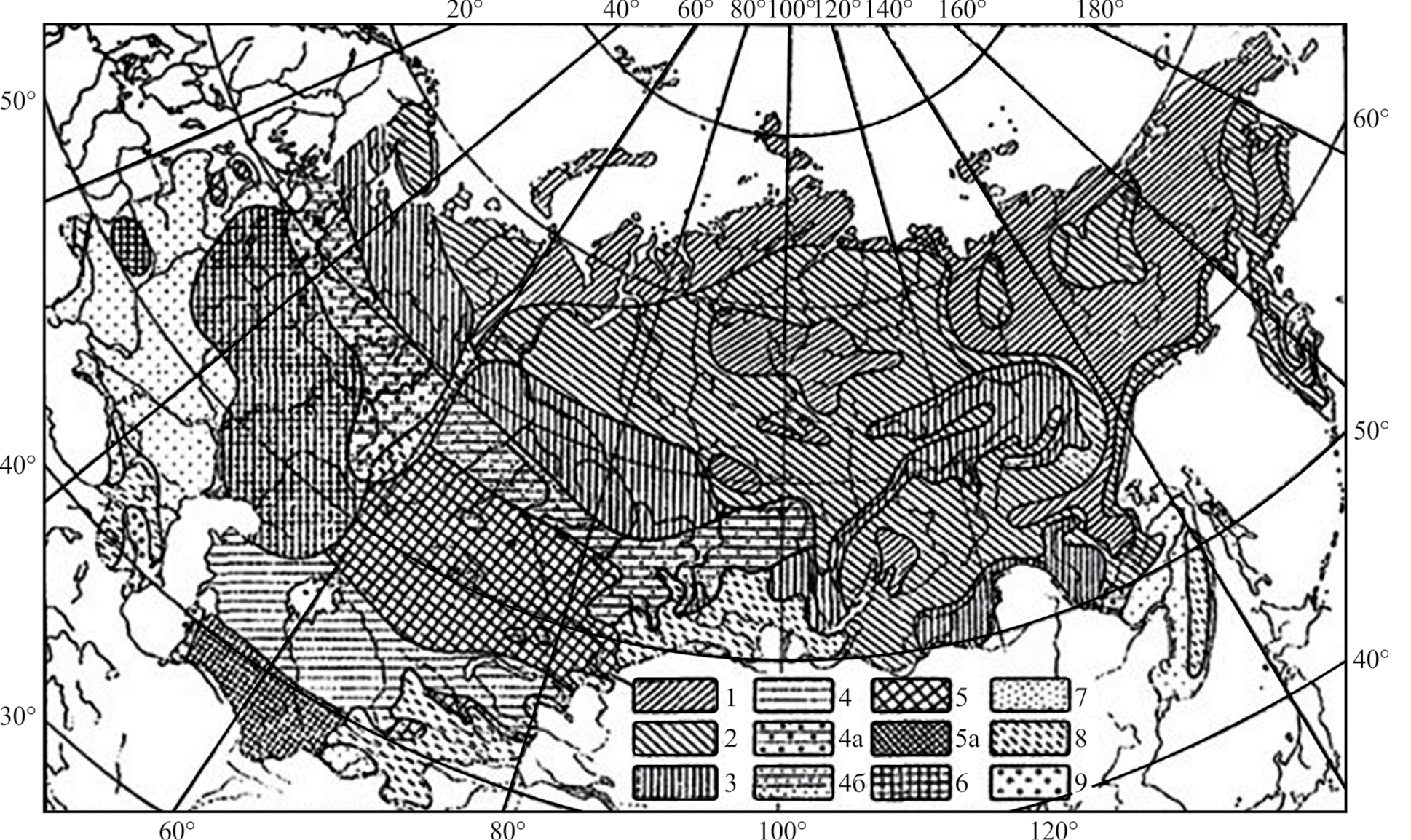 Рис. 2. Вероятность опасных заморозков осенью (на десятилетие): 1 — ежегодные (нет посевов); 2 — более пяти лет (опасны летом); 3 — от трех до четырех лет; 4, 4а и 4б — от двух до трех лет; 5 и 5а — от одного года до двух лет; 6 и 6а — один или без заморозков; 7 — не опасны (позднее наступление заморозков); 8 — горные р-ны со сложным распределением заморозков (опасность не характеризуется); 9 — опасны зимой для субтропических культур (по: Гольцберг, 1949).