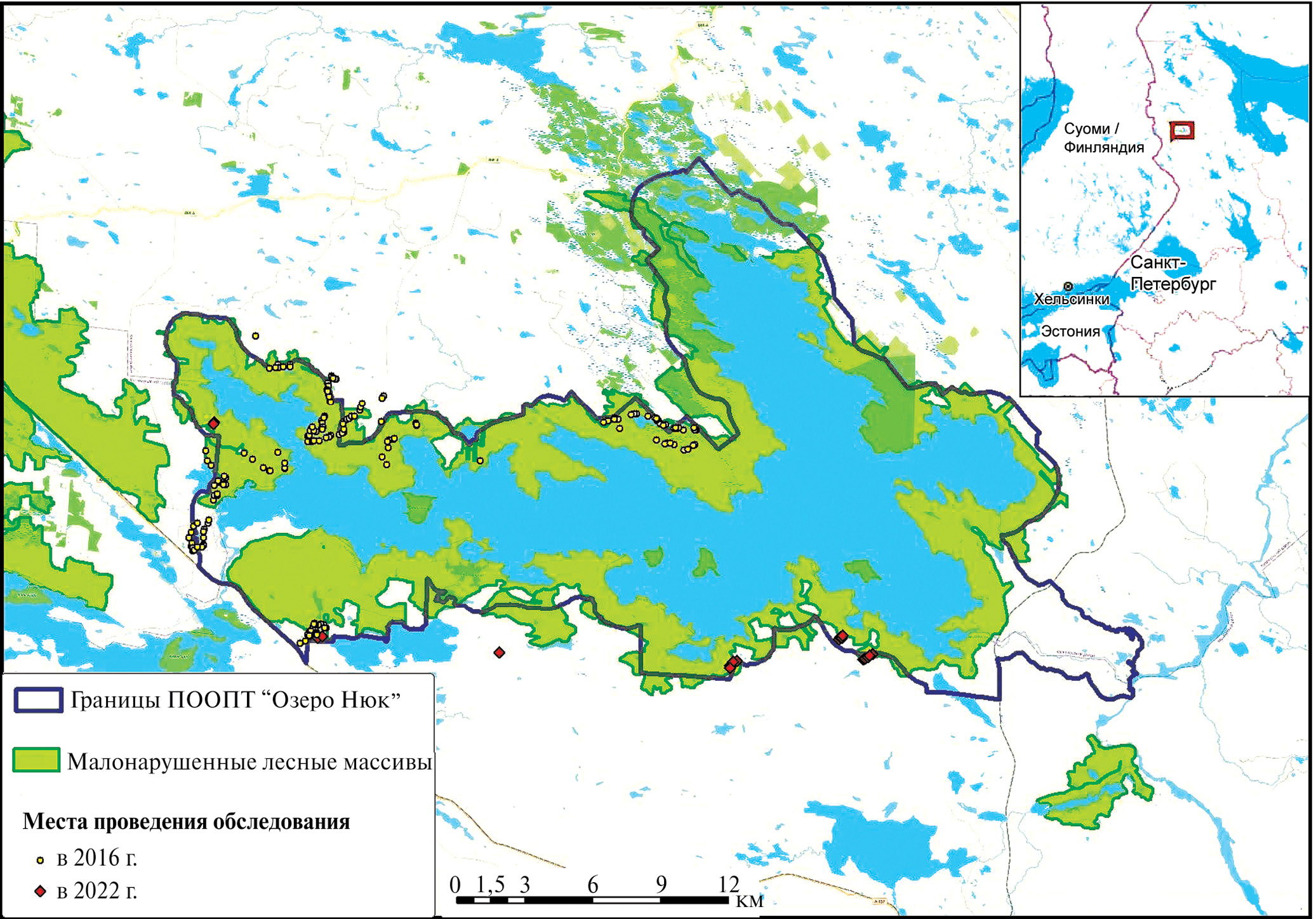 Планируемая особо охраняемая природная территория (ПООПТ) “Озеро Нюк” находится на северо-западе Республики Карелия в Муезерском и Калевальском р-нах и на территории Костомукшского городского округа (рис. 1). Озеро Нюк принадлежит к бассейну Белого моря (водосбор р. Кеми, система р. Каменной). ПООПТ располагается в северной части Западно-Карельской возвышенности (Gromtsev et al., 2011). Территория вокруг озера Нюк относится к двум типам ландшафта: денудационно-тектоническому с комплексами ледниковых образований холмисто-грядовому среднезаболоченному с преобладанием сосновых местообитаний и ледниковому холмисто-грядовому сильнозаболоченному с преобладанием сосновых местообитаний (Gromtsev, 2008).
