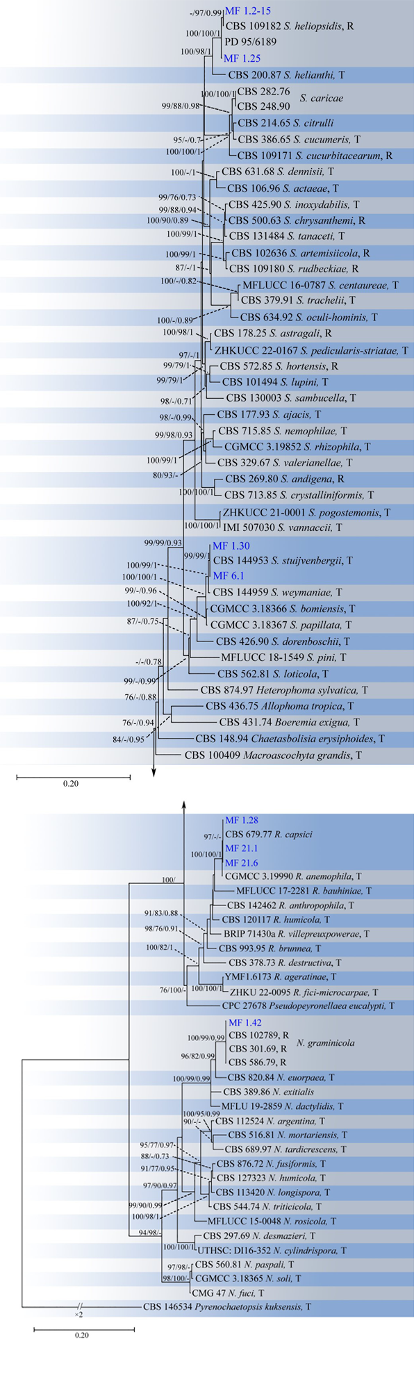Изолят MF 1.42 на мультилокусном филогенетическом древе формировал кладу с тремя репрезентативными штаммами Neoascochyta graminicola (Punith.) Qian Chen et L. Cai CBS102789, CBS301.69 и CBS586.79. Три изолята MF 1.28, MF 21.1, MF 21.6 формировали кладу вместе с типовым штаммом Remotididymella capsici (Bond.-Mont.) L.W. Hou, L. Cai et Crous CBS679.77. Четыре изолята Stagonosporopsis на комбинированной филограмме входили в состав двух клад. Одну составляли два изолята MF 1.2—15 и MF 1.25 и репрезентативный штамм Stagonosporopsis heliopsidis (H.C. Greene) Aveskamp, Gruyter et Verkley CBS109182, вторую — MF 1.30, MF 6.1 и типовой штамм S. stuijvenbergii Hern.-Restr., L.W. Hou, L. Cai et Crous CBS144953.