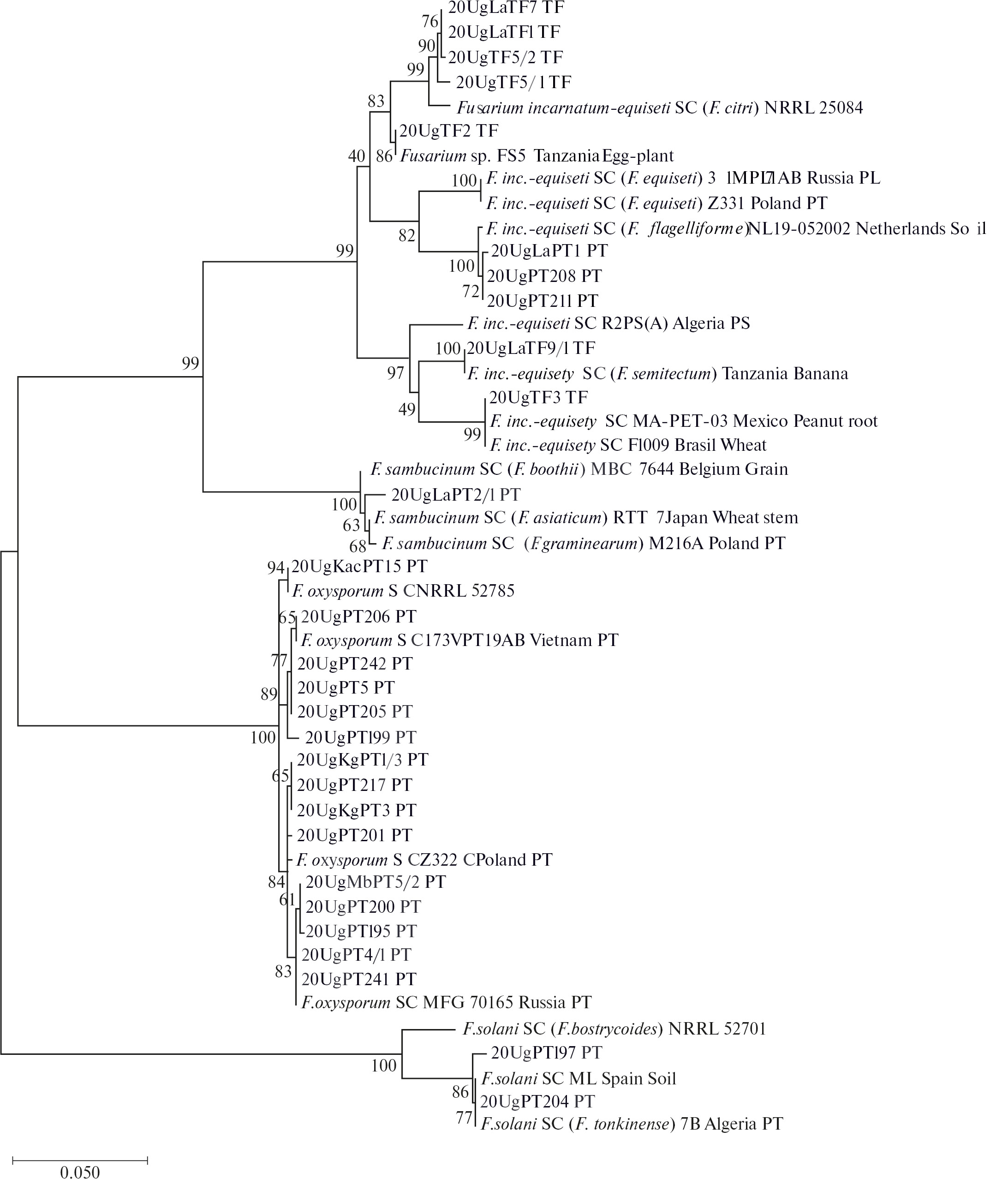 Fig. 2. Phylogenetic tree inferred from maximum-likelihood analysis of the concatenated alignment, including partial tef gene region (675 bp). The confidence values are indicated at the branches (1000 bootstrap replicates). PT, PL, PS — isolates from potato tubers, leaves, stems correspondingly, TF — from tomato fruits, SC — species complex.