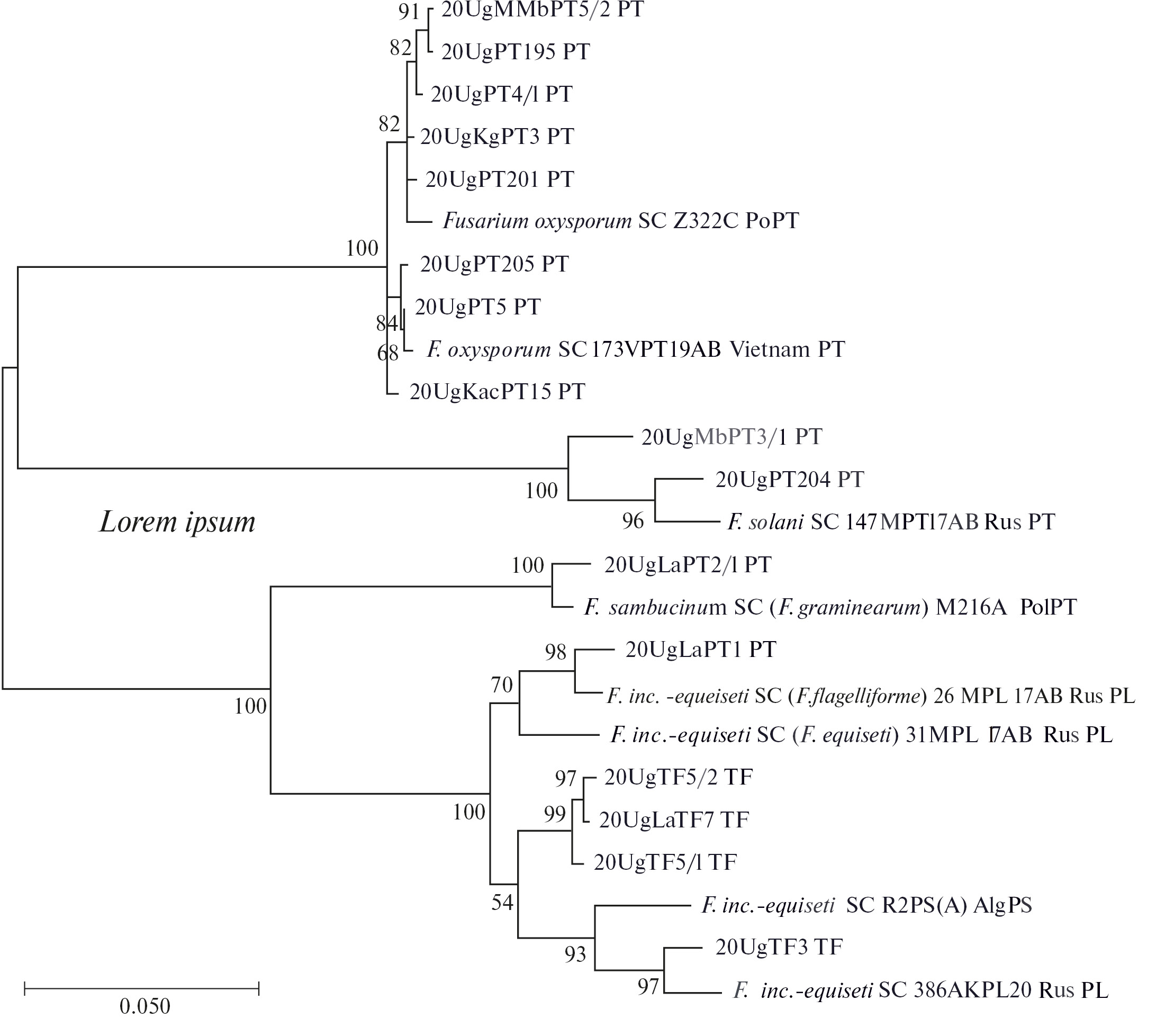 PCR was conducted using a Biometra T1 amplifier (Biometra, Germany). For each sample, 0.5 µl of 100 mM forward and reverse primers, 0.5 µl of dNTP (10 mM each), 0.5 µl of DNA polymerase (5 units/µl), 2.5 µl of 10x PCR buffer were taken. DNA fragments ITS1—5.8S–ITS2 [(primers ITS4 and ITS5, (White et al., 1990)], β-tub gene fragments [Btu-F-F01 and Btu-F-R01, (Watanabe et al., 2011)], and tef1 were amplified [EF1 and EF2, (O’Donnell et al., 1998)]. The amplification program consisted of an initial denaturation step at 94 оC for 1 minute, followed by 30 cycles of denaturation at 94 °C for 30 seconds, primer annealing (at 52 оC for ITS4/ITS5, 57 оC for Btu-F-F01/Btu-F-R01, and 54 оC for EF1/EF2) for 30 seconds, and elongation at 72 оC for 70 seconds. A final elongation step was performed at 72 оC for 5 minutes. Each PCR experiment included both negative controls (Nucleic acid-free water) and positive controls (known DNA samples expected to yield an amplicon of a specific size). After the PCR reaction, the length and purity of the amplified DNA products were assessed using electrophoresis in a 1% agarose gel containing ethidium bromide. Once the electrophoresis was completed, a gel piece containing the desired amplicon size was excised with a sterile scalpel and placed in a microtube. The extraction of DNA from the gel was performed according to the manufacturer’s instructions specified in the CleanUp Standard gel kit (Evrogen Ltd, Russia). For DNA sequencing, the Sanger method was employed by the Evrogen Ltd company. The obtained DNA sequences were compared with existing sequences from the NCBI GenBank database. DNA sequence analysis was conducted using the MEGA 10 software for further investigation and identification of the isolated Fusarium species.