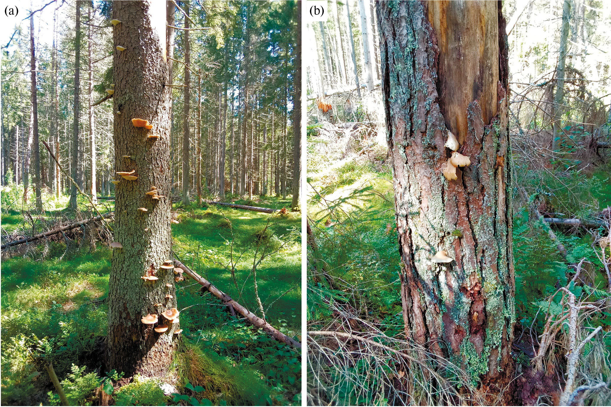 An unexpected fact is the occurence of the fungus Pleurotus abieticola, previously not noted in either St. Petersburg or the Leningrad Region. This is a saprotrophic species causing white rot. There is a finding on living Picea abies (Fig. 4), but the fruiting bodies developed at the site of necrosis that occurred as a result of pruning, so the saprotrophic status of the species is not disputed in this case either. This species was considered rare (Palamarchuk, 2023), but our studies revealed an outbreak of its mass development, exceeding that of Fomitopsis pinicola in one of the affected sites. Probably, outside the development of forest epiphytoties, this species has a competitive limitation, since its niche is occupied by its ecological analogue, the white rot fungus Trichaptum abietinum.