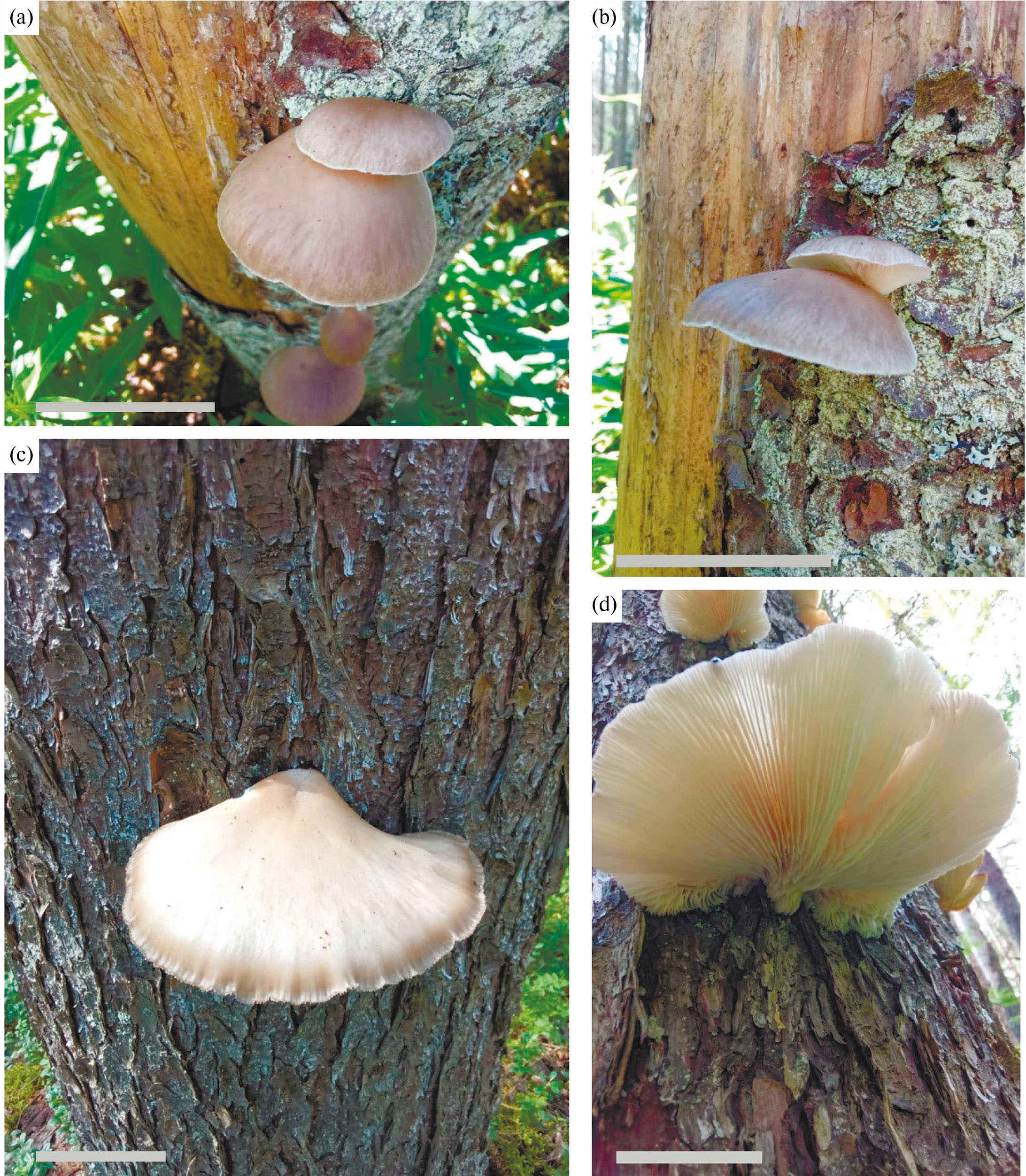Fig. 3. Basidiomata of Pleurotus abieticola (LE 287757, LE 287758) appeared on dead wood of Picea abies (Gladyshevsky protected area): a – upperside of young fruiting bodies; b – upperside of mature fruiting bodies; c – young fruiting bodies from the front; d – hymenophore of mature fruiting bodies (the favoloid pattern is visible on the part of descending onto the stipe). Scale bar – 5 cm.