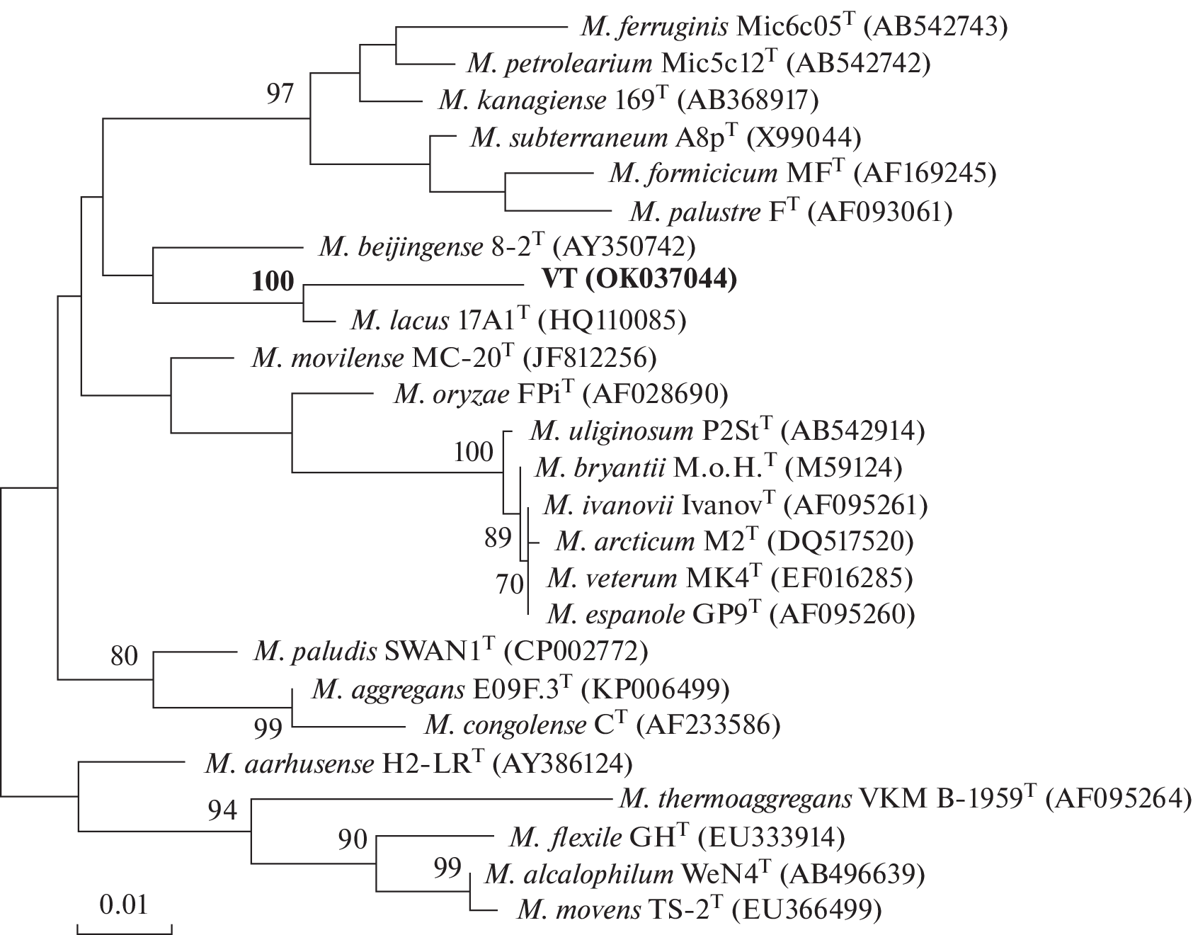 Abstract—A new strain of methanogenic archaea, designated VTT, was isolated from a sample of Spitsbergen permafrost. The cells were nonmotile curved rods, 2.7–5.3 × 0.3 µm. The optimal conditions for growth were 20°C, pH 6.6, and NaCl concentrations 0.03–0.05 M. The H2/CO2 gas mixture was the only substrate used. In the presence of H2/CO2, growth was stimulated by addition of yeast extract or rumen fluid. Phylogenetic analysis of the 16S rRNA gene sequences indicated that strain VTT belonged to the genus Methanobacterium and was most closely related to M. lacus 17A1T (97.02% similarity). Comparison of the sequenced and assembled genome of strain VTT with the genomes of other members of this genus confirmed these results and revealed species-level differences. Our results indicate that this methanogenic isolate belongs to a new species of methanogenic archaea, for which the name Methanobacterium spitsbergensе sp. nov. was proposed, with the type strain VTT (=VKM B-3566T = JCM 39284T).