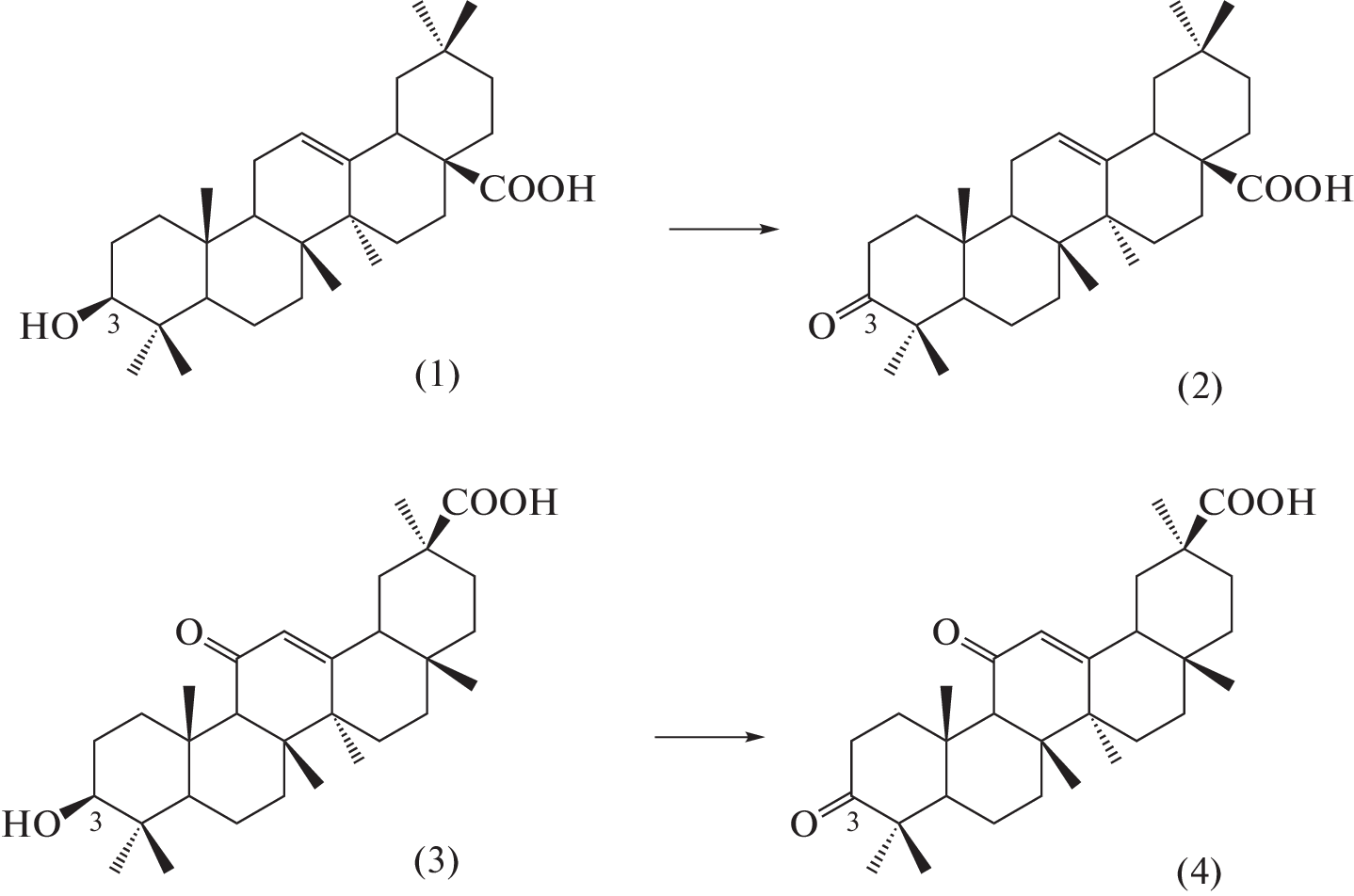 Abstract—The optimal conditions for C3 oxidative biotransformation of 1.0 g/L pentacyclic triterpenoids oleanolic (OA) and glycyrrhetic (GA) acids were determined using the resting cells of Rhodococcus rhodochrous IEGM 1360 from the Regional Specialised Collection of Alkanotrophic Microorganisms. Suspensions of the resting cells with OD600 2.6 in pH 8.0 buffer and OD600 2.2 in pH 6.0 buffer showed the highest catalytic activity against OA and GA, which ensured the formation of 61 and 100% of their 3-oxo derivatives, respectively. Using phase contrast, atomic force, and confocal laser scanning microscopy, an adaptive response of rhodococci to the effects of OA and GA was revealed. In silico, the apoptotic and antioxidant activities of 3-oxo-OA and 3-oxo-GA, respectively, have been assumed. In vitro, a pronounced antibacterial activity of 3-oxo-OA against Micrococcus luteus, Escherichia coli, Staphylococcus aureus, and Bacillus subtilis was shown. The absence of toxic effects of the triterpenoids and their 3-oxo derivatives on aquatic and plant objects was demonstrated in silico and in vitro, respectively.