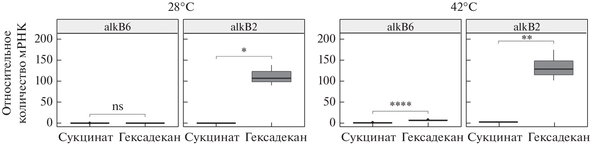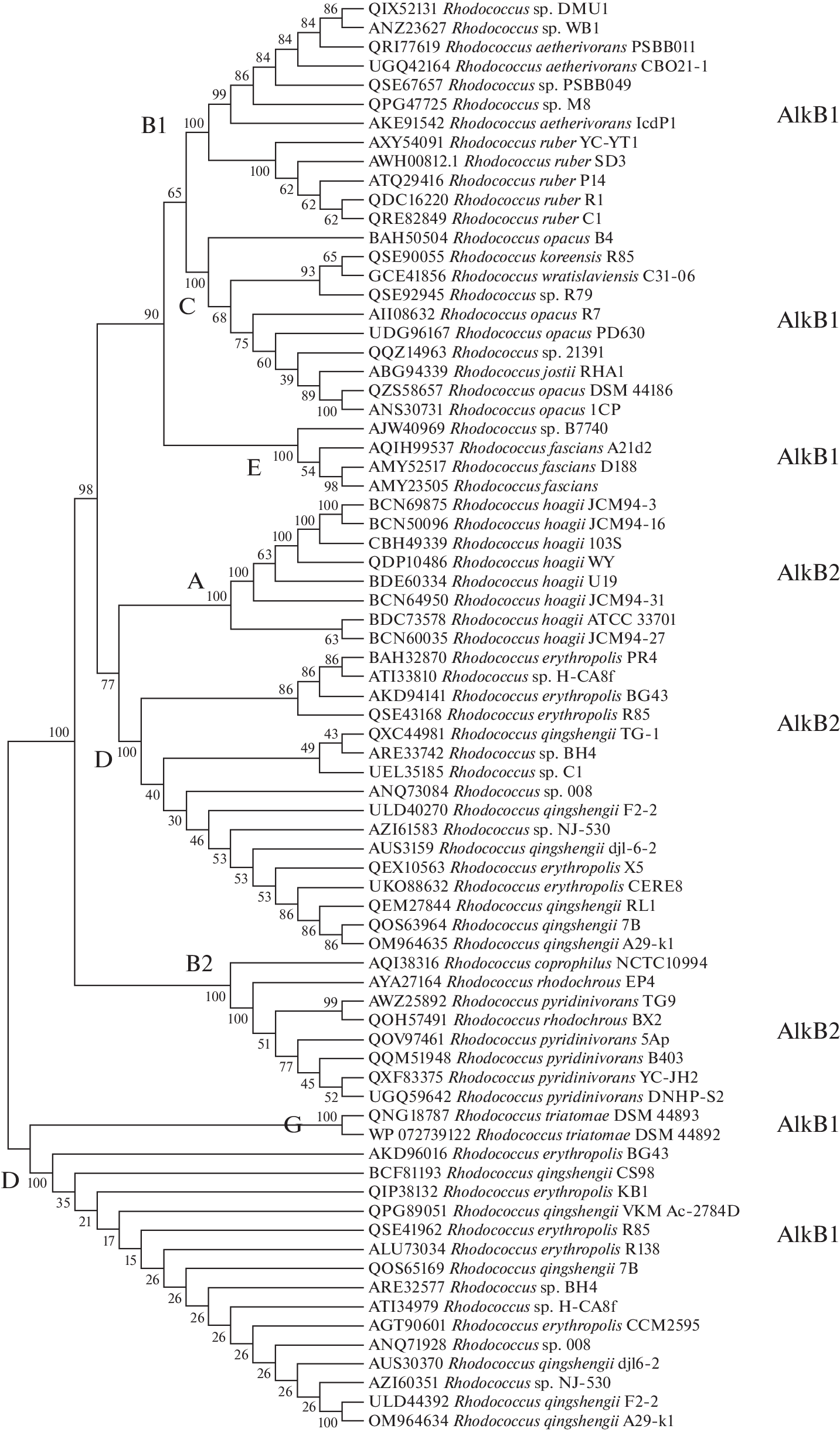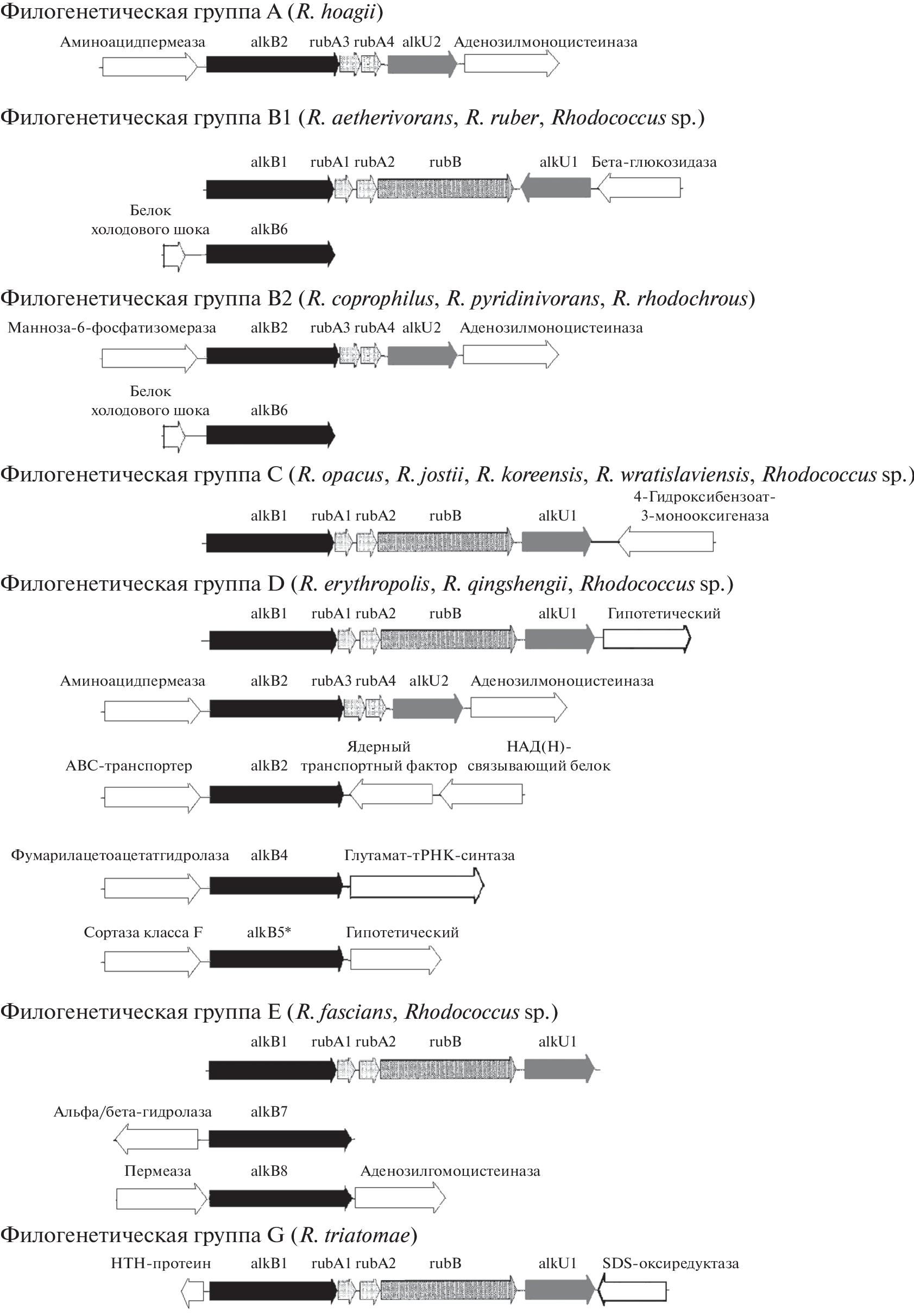 Выявлены особенности в организации и локализации генов alkB и кодируемых ими алкан-1-моноксигеназ у бактерий рода Rhodococcus. Установлено, что для всех представителей одной филогенетической группы характерен определенный тип генов alkB (тип alkB1 в составе оперонов, содержащих гены, кодирующие рубредоксины, рубредоксинредуктазу и регуляторный белок, и/или тип alkB2 в составе оперонов без гена, кодирующего рубредоксинредуктазу, и дополнительно отдельно локализованные детерминанты типа alkB3‒alkB8). Гены alkB1-типа присутствовали в хромосомах бактерий групп B1 (R. aetherivorans, R. ruber), С (R. opacus, R. jostii, R. wratislaviensis, R. koreensis), D (R. erythropolis, R. qingshengii), G (R. triatomae) и E (R. fascians). Гены alkB2-типа находились в строго определенных локусах хромосом бактерий филогенетических групп А (R. hoagii/R. equi), В2 (R. coprophilus, R. pyridinivorans, R. rhodochrous) и D (R. erythropolis, R. qingshengii). Отдельно локализованные гены alkB3‒alkB5 обнаруживались в хромосомах бактерий группы D (alkB5 только у представителей вида R. qingshengii), гены alkB6 – бактерий группы B1 и В2, гены alkB7‒alkB8 – бактерий группы Е. Белки, кодируемые генами alkB1 и alkB2, представлены тремя филогенетическими группами. Первая из них включала белки AlkB1-типа бактерий группы В1 и С, а также белки AlkB2-типа бактерий группы D и А; вторая – белки AlkB2-типа бактерий группы В2; третья ‒ белки AlkB1-типа бактерий группы G и D. Алкан-1-монооксигеназы, кодируемые отдельно локализованными генами alkB3‒alkB8, представлены тремя филогенетическими линиями: первая – AlkB3‒AlkB5, вторая – AlkB6 третья – AlkB7 и AlkB8. В геноме бактерий R. pyridinivorans 5Ар выявлены характерные для представителей группы В1 гены alkB2 и alkB6. Показано, что данные детерминанты необходимы для синтеза биоПАВ. У мутанта с нарушенным геном alkB2 эмульгирующая активность уменьшалась при 28 и 42°С, соответственно, в 16 и 3 раза, а количество содержащих трегалозу сурфактантов – в 7 и 3 раза. У мутанта с нарушенным геном alkB6 вне зависимости от температуры культивирования регистрировали снижение эмульгирующей активности в 1.2 раза и уменьшение синтеза содержащих трегалозу сурфактантов более чем в 2 раза. Полученные результаты свидетельствовали о ключевой роли гена alkB2 в синтезе биоПАВ при разных температурных режимах. В то же время роль гена alkB6 возрастала при температуре 42°С, что могло быть обусловлено его повышенной транскрипционной активностью.