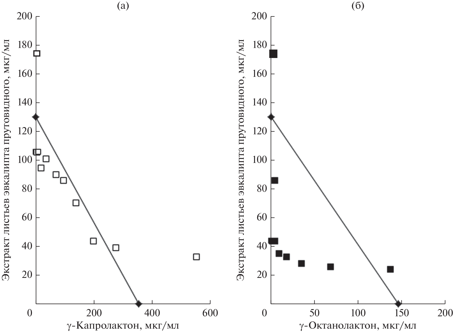 Abstract—The goal of the study was to investigate the mechanism of quorum sensing (QS) inhibition in the model bacterium Chromobacterium subtsugae 026 (previously – C. violaceum 026) by Eucalyptus viminalis Labill leaf extract, and to identify the plant-derived components that provide this biological activity. The raw extract showed pronounced anti-QS activity within a broad concentrations range which were an order of magnitude lower than required for bacterial growth suppression (the MIC50/EC50 ratio of 43.6). Chemical analysis of the extract revealed six small plant-derived molecules: pyrogallol, 2,3-dihydro-3,5-dihydroxy-6-methyl-4H-pyran-4-1, p-cymene, 4-((1E)-3-hydroxy-1-propenyl)-2-methoxyphenol, gallic and palmitic acids, whose inhibitory effect on QS in Chromobacterium spp. has previously been shown by in vitro experiments or predicted by in silico models. In addition, minor components γ-caprolactone and γ-octanolactone, structurally similar to acylated homoserine lactones, QS autoinducers in Chromobacterium spp., were found in the extract. Chemically synthesized analogs of these molecules showed anti-QS activity in the C. subtsugae 026 bioassay (ЕС50 = 354.2 and 145.6 µg/mL, respectively). Enrichment of the E. viminalis leaf extract with γ-caprolactone or γ-octanolactone significantly increased the anti-QS activity of these compositions, which was determined by isobolographic analysis as additive or superadditive effects.