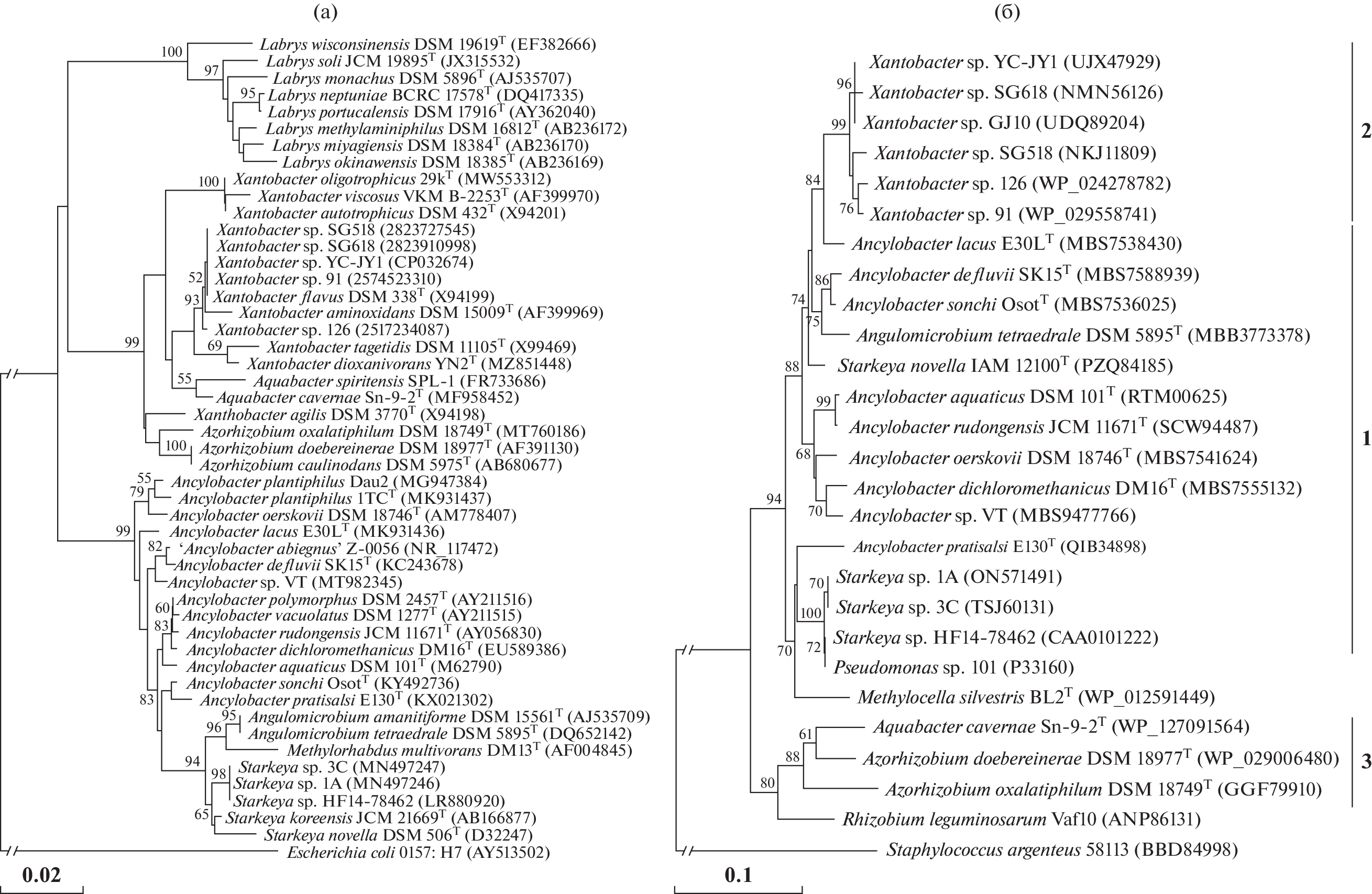 Abstract—Comparative phylogenetic analysis of NAD+-dependent formate dehydrogenases (NAD+–FDH) genes, which have been detected in all available genomes of methylotrophs of the genera Ancylobacter, Starkeya and Angulomicrobium, as well as in other members of the family Xanthobacteraceae (Xanthobacter, Aquabacter, Azorhizobium), was carried out. The position of Xanthobacteraceae on the tree constructed based on comparison of NAD+–FDH amino acid sequences was found to correlate with the 16S rRNA gene-based phylogeny. The sequences of the NAD+–FDH proteins of the genera Ancylobacter, Starkeya, and Angulomicrobium exhibited 87.8–98.3% identity, indicating that this protein is very conservative within this group of methylotrophs. For the first time, analysis of the NAD+–FDH functional genes is recommended as a supplementary criterion for interspecies differentiation between methylotrophic bacteria of the genus Ancylobacter.