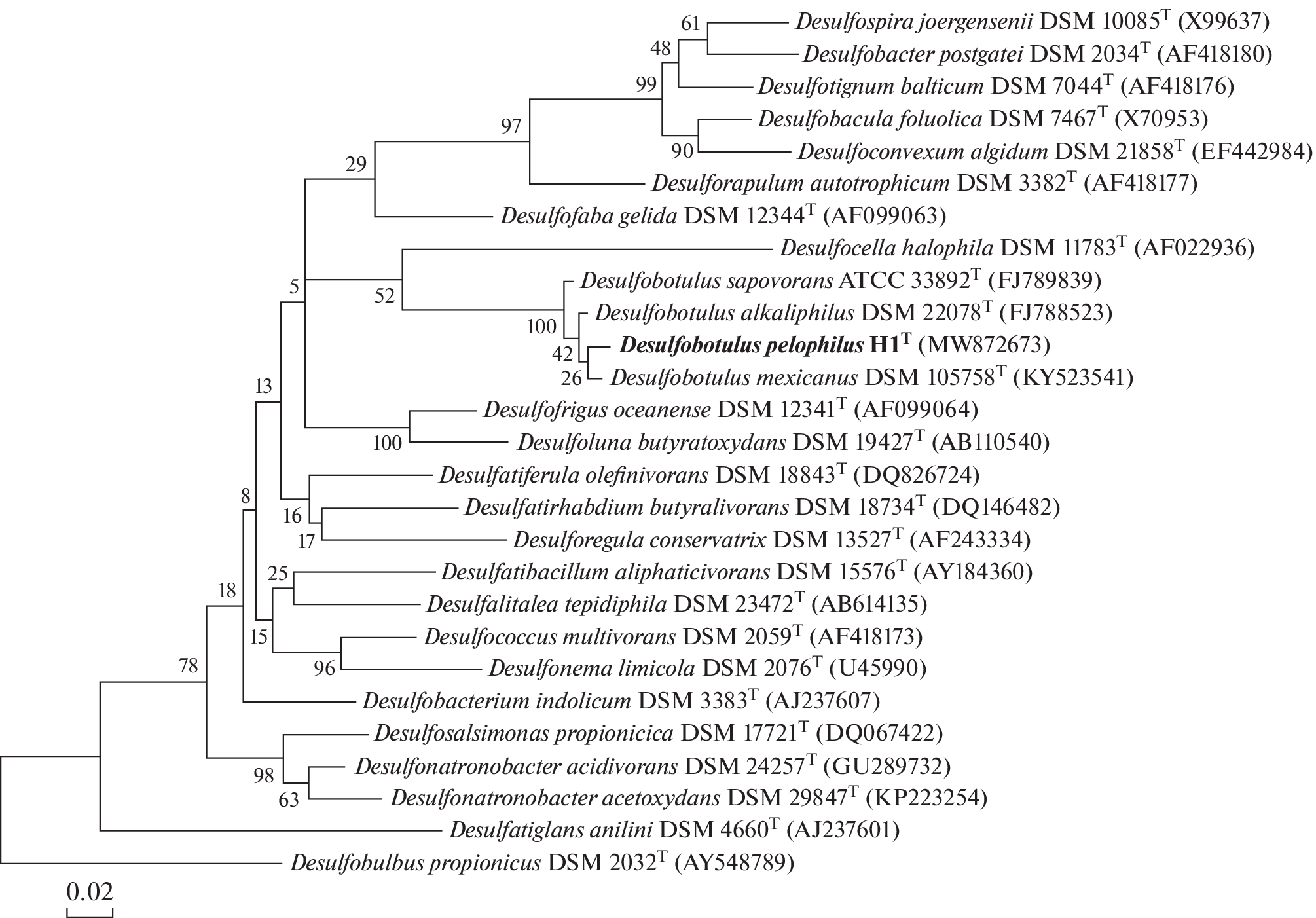 Abstract—An alkaliphilic, sulfate-reducing, anaerobic bacterium (strain H1T) was isolated from a terrestrial mud volcano at the Taman Peninsula, Russia. The cells of the isolate were gram-negative motile vibrios, 1 µm in diameter and 2.0–2.5 μm in length. Strain H1T grew at 14–42°C (optimum at 37°C), pH 8.5–10.5 (optimum at pH 9.5), and NaCl concentrations of 0.5–6% (wt/vol) (optimum at 0.5–1.5%); pyruvate, lactate, butyrate, caproate, or pelargonate were used as electron donors, and elemental sulfur, sulfite, or sulfate were used as electron acceptors. Pyruvate and lactate were fermented. No growth occurred in the presence of oxygen. Thiosulfate, DMSO, fumarate, nitrate, nitrite, arsenate, selenite, and Fe(III) were not used as electron acceptors. Elemental sulfur, thiosulfate, and sulfite were not disproportionated. Glucose, fructose, sucrose, trehalose, galactose, xylose, fumarate, citrate, yeast extract, and peptone were not fermented. Predominant fatty acids were C20:0 (54.2%), C22:0 (24.6%), and C18:0 (11.1%). The genome of strain H1T was 3.66 Mb in size and had G + C DNA content of 51.1%. The genome contained the genes encoding the enzymes of dissimilatory sulfate reduction and β-oxidation of fatty acids. According to the results of analysis of the 16S rRNA gene sequence, Desulfobotulus mexicanus was the organism most closely related to strain Н1Т (98.3% similarity). Based on its phenotypic characteristics and the data of phylogenetic analysis, affiliation of the isolate as member of a novel Desulfobotulus species, Desulfobotulus pelophilus sp. nov., is proposed, with the type strain H1T (=DSM 112796T = VKM B-3697Т =UQM 41590T).