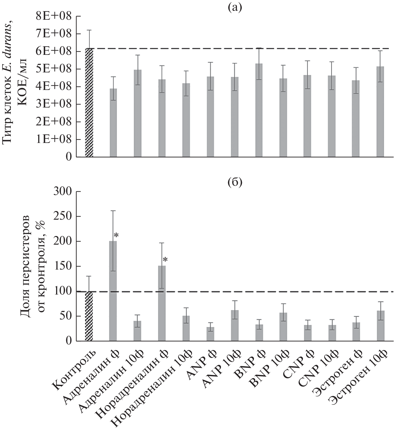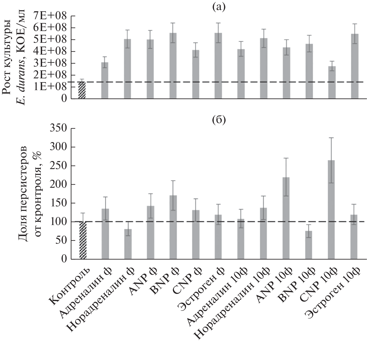 Abstract—Lactic acid bacteria (LAB) are important components of the human microbiome. While they are capable both of synthesis and response to the signals of the human humoral regulatory system (hormones and neuromediators), the phenomenology and mechanisms of the LAB response to these mediators are insufficiently studied. This work showed estrogen to hinder the growth and development of E. durans, while norepinephrine, estrogen, and the brain natriuretic peptide caused dose-dependent extension of the stationary growth phase. This is the first report on stimulation of E. durans biofilm formation by the atrial natriuretic peptide and estrogen. The frequency of persister formation depended on the type of bacterial growth (planktonic or biofilm one) and was higher in the case of biofilm growth. Epinephrine and norepinephrine exhibited dose-dependent stimulation of persister formation in planktonic LAB cultures, while other tested hormones inhibited it. The effect on persister formation in biofilms was different: natriuretic peptides exhibited dose-dependent stimulation of persister formation, and none of the hormones inhibited it significantly. After several months of incubation, E. durans persister cells matured to anaaaaaaaaabiotic dormnt forms with the typical ultrastructural features. The population of E. durans dormant forms was first shown to contain the form with different dormancy depth, including the viable uncultured ones.