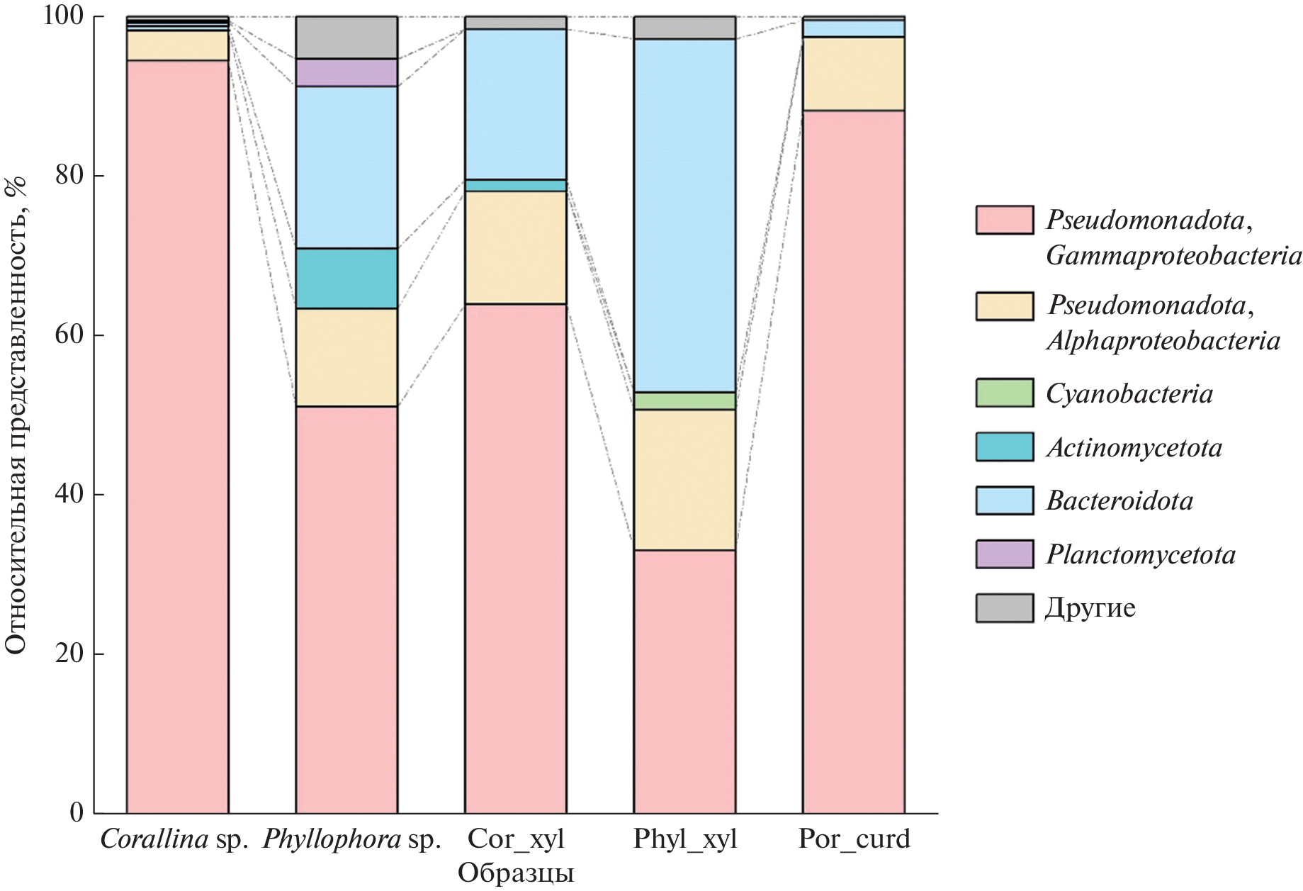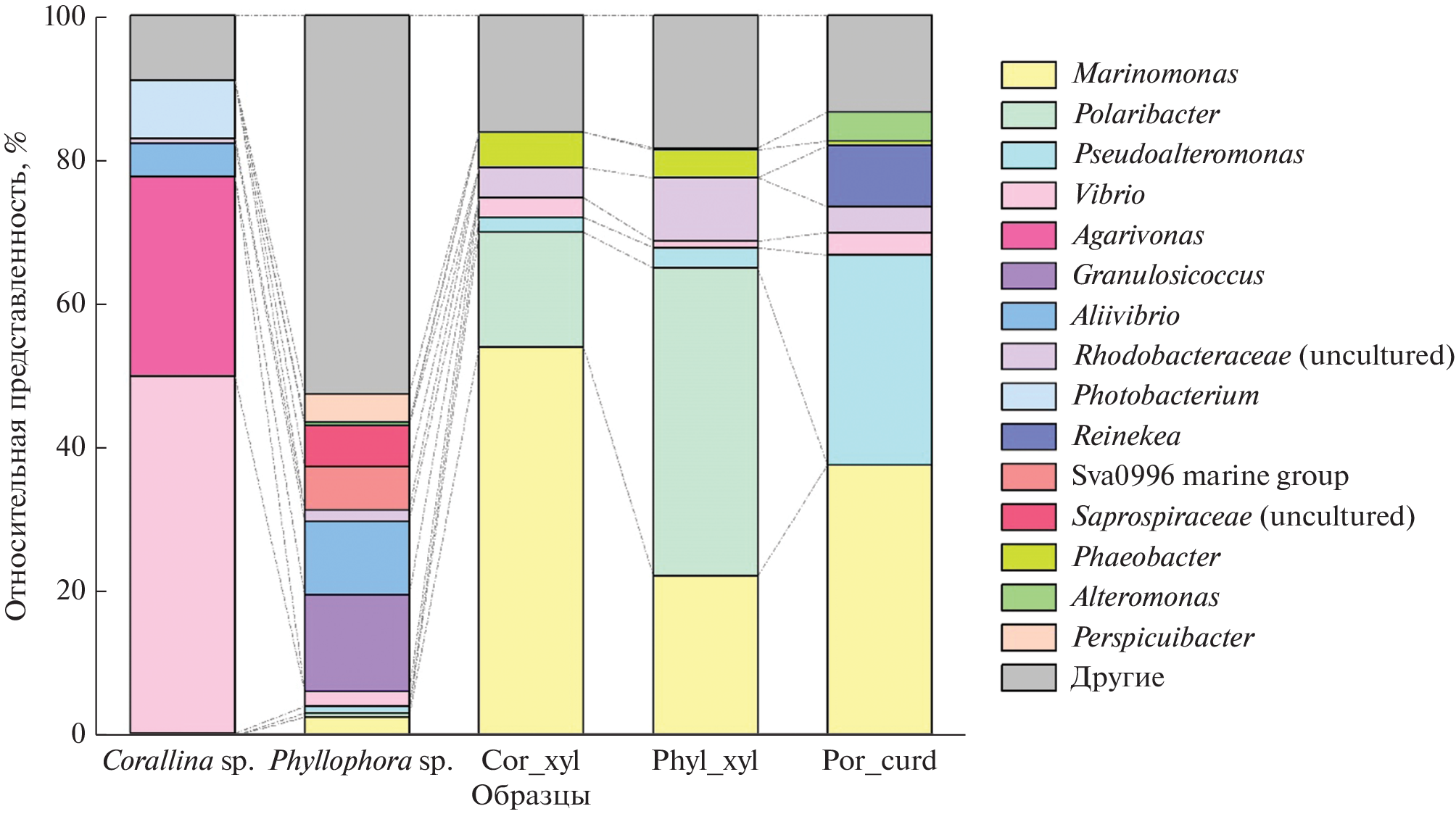—Microorganisms associated with algae and able to utilize complex substrates (e.g., plant heteropolysaccharides) may be important producers of hydrolytic enzymes. The microbial communities of the red algae Corallina sp. and Phyllophora sp. sampled in the Kandalaksha Gulf basin of the White Sea were analyzed using high-throughput sequencing of the V4-variable region of the 16S rRNA gene. The dominant phyla in microbiomes of both samples were Pseudomonadota and Bacteroidota (GTDB classification, https://gtdb.ecogenomic.org/). For the Corallina sp. sample, dominance of the Vibrio, Agarivorans, and Photobacterium genera was shown, while Granulosicoccus and Aliivibrio dominated in the Phyllophora sp. sample. The analyzed red macroalgae with associated microbiota were used as an inocula to obtain microbial enrichment cultures growing on β-1,4-xylan or β-1,3-glucan (сurdlan). It was shown that, similar to environmental samples Pseudomonadota and Bacteroidota phyla representatives were prevalent in all enrichment cultures. However, unlike the environmental samples, in the enrichment cultures the dominant genera were Marinomonas, Reinekea, Polaribacter, and Pseudoalteromonas. The latter, as well as the representatives of Vibrio sp., were isolated in pure cultures for which the xylanolytic activity was shown.