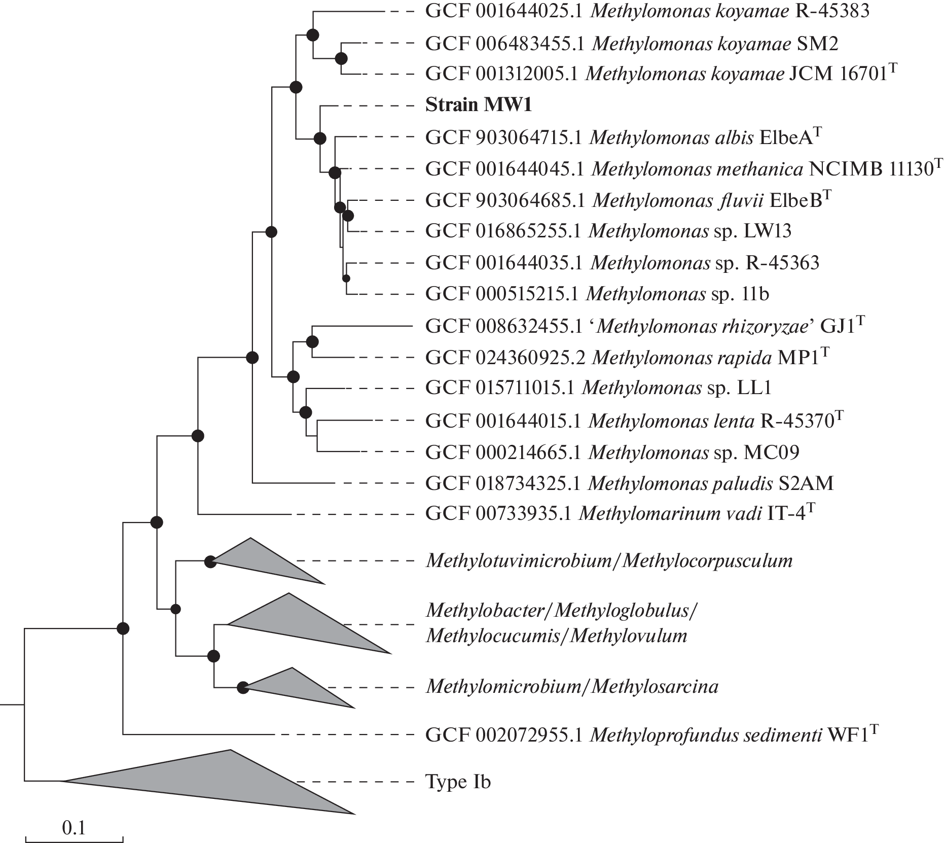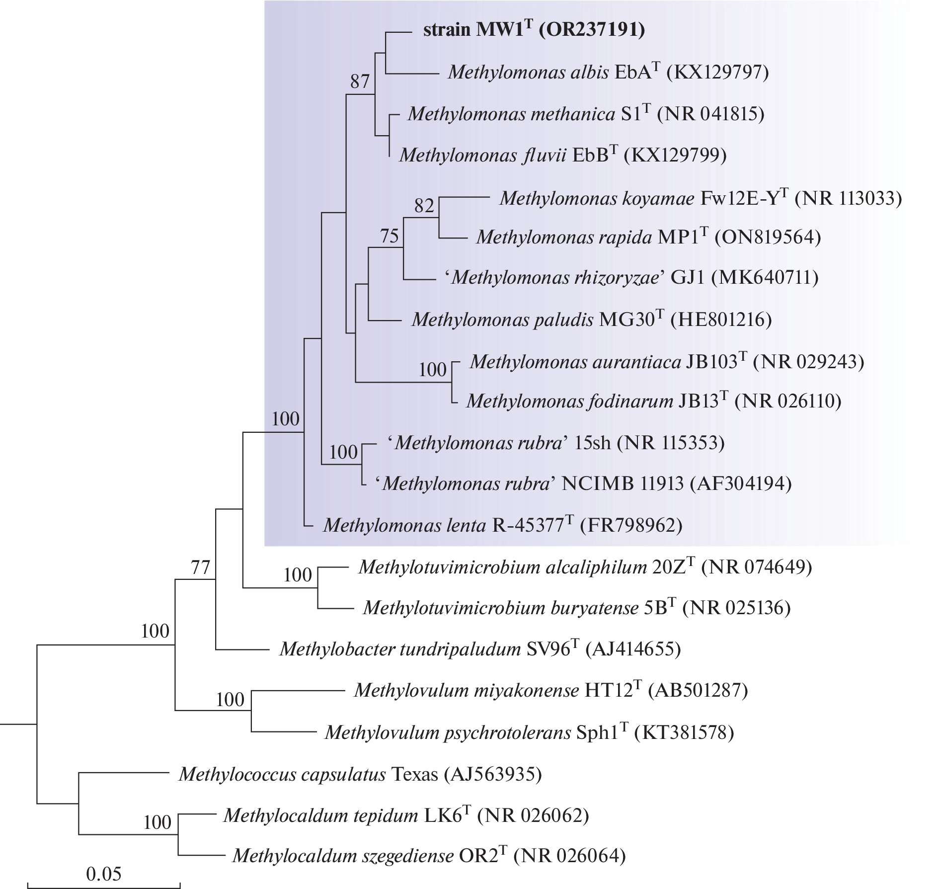 Aerobic methanotrophic bacteria of the genus Methylomonas inhabit a wide spectrum of habitats including freshwater bodies, river sediments, wetlands, rice paddies, landfill cover soils, and hydromorphic soils. Majority of the currently described species of this genus are represented by neutrophilic, motile, growing on methane rod-shaped bacteria, whose pigmentation varies from yellow to pink and red. This study reports characterization of a novel, unpigmented isolate of these bacteria, strain MW1T, which was obtained from sediments of the mountain river Khosta, Krasnodar region, Russia. Strain MW1T grew on methane and methanol within a temperature range of 8–37°C (optimum at 25–30°C) and at рН 5.5–7.5 (optimum at 6.3–7.0). The 16S rRNA gene sequence of strain MW1T displayed 95.48–98.47% similarity to those in earlier described Methylomonas. The closest taxonomically characterized phylogenetic relative of strain MW1T was M. fluvii EbBT, isolated from the river Elbe sediments. Complete genome sequence of strain MW1T was 4.6 Mb in size and contained three rRNA operons and about 4200 protein-encoding genes, including the gene cluster pmoCAB coding for membrane methane monooxygenase. Soluble methane monooxygenase was not encoded in the genome. The G+C DNA content was 52.4%. The average nucleotide identity of the genome of strain MW1T with those in earlier described representatives of the genus Methylomonas was 79.4–82.1%. We propose to classify this isolate as representing a novel species of the genus Methylomonas, M. montana sp. nov. Strain MW1T (=VKM 3737T = UQM 41536T) is the type strain of the newly proposed species.