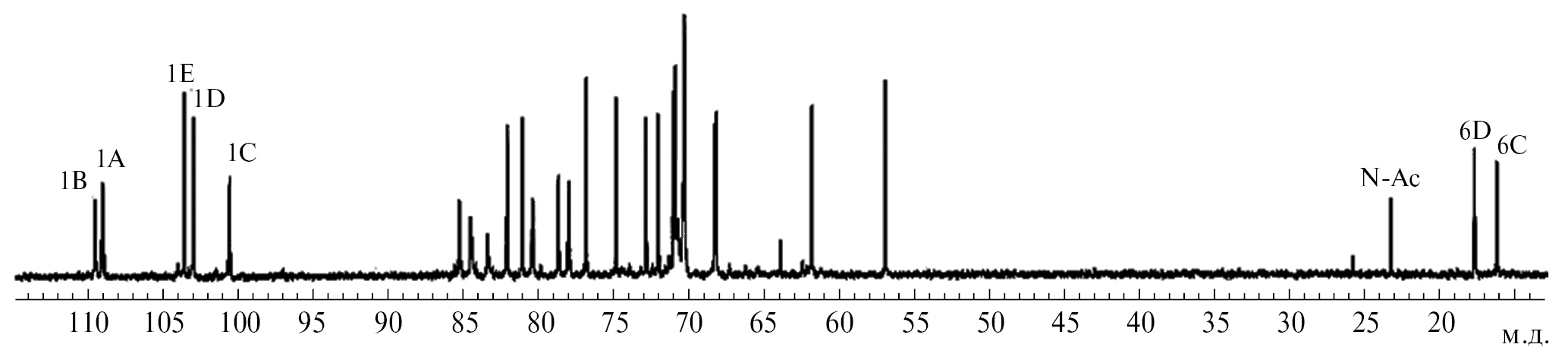 Спектр 13C ЯМР (рисунок, табл. 1) препарата “холодной экстракции” из штамма ВКМ Ас-1402Т был типичным для полисахарида с регулярно повторяющимся звеном. Этот спектр содержал пять сигналов примерно одинаковой интегральной интенсивности в аномерной области атомов углерода δС 100–110 м. д., два сигнала от 6-дезоксисахаров (16.5 и 17. 9 м. д.) и сигнал от CH3-группы N-ацетила при 23.5 м. д. Остальные сигналы были расположены в области δС 57–86 м. д.