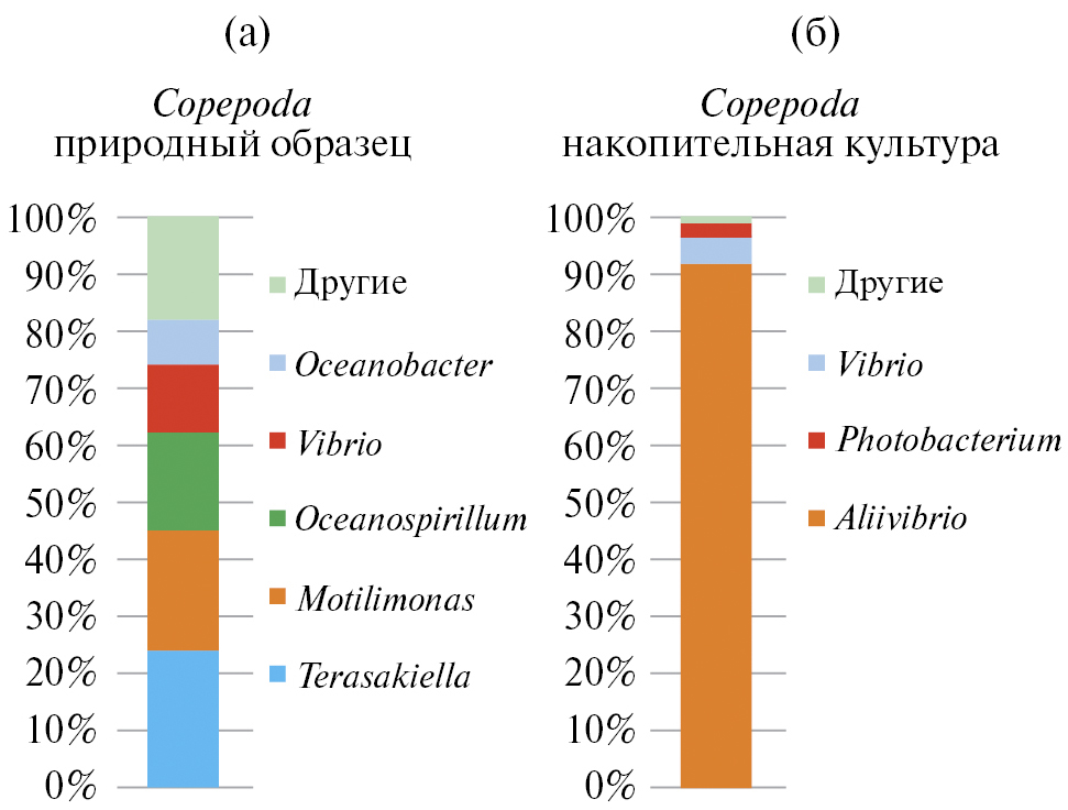 В природном образце CN представляющем собой гомогенат особи Copepoda sp. (рис. 1а) доминировали бактерии рода Terasakiella (24%), Motilimonas (21%) и Oceanospirillum (17%). Также в сообществе присутствовали бактерии родов Vibrio (12%) и Oceanobacter (8%).