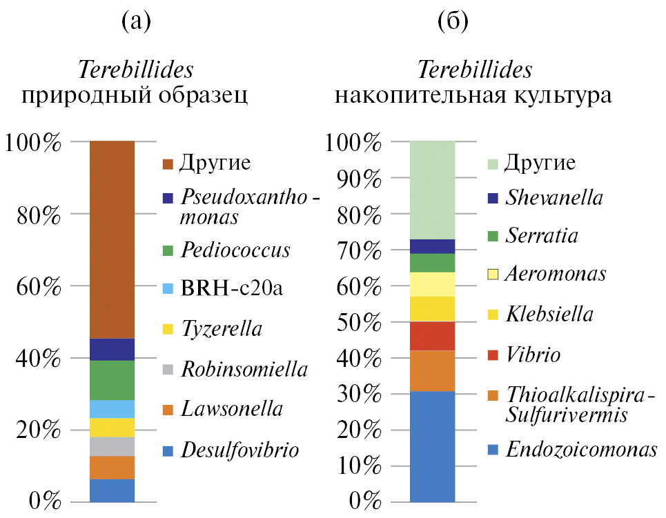 В накопительной культуре TE, полученной из образца Terebelides и использующей хитин (рис. 2а), 31% составляли представители рода Endozoicomonas (Pike, 2013). Также в значительном количестве (11%) присутствовали представители рода Thioalkalispira. По 7% от общего количества прокариот составляли бактерии родов Klebsiella и Aeromonas, 5% — представители рода Serratia и 4% — Shewanella.
