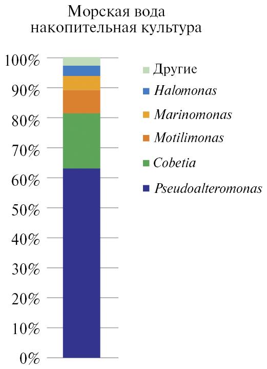 Состав накопительной культуры ME, полученной из воды Кандалакшского залива и разлагающей хитин, существенно отличался от опубликованного микробиома этой воды (Pesciaroli et al., 2012), хотя, конечно, сравнивать их следует с большой осторожностью из-за большой временной разницы и, возможно, различных точек отбора проб. В накопительной культуре доминировали бактерии рода Pseudoalteromonas, многие представители которого способны к разложению хитина (Paulsen et al., 2016; Wang, 2021).