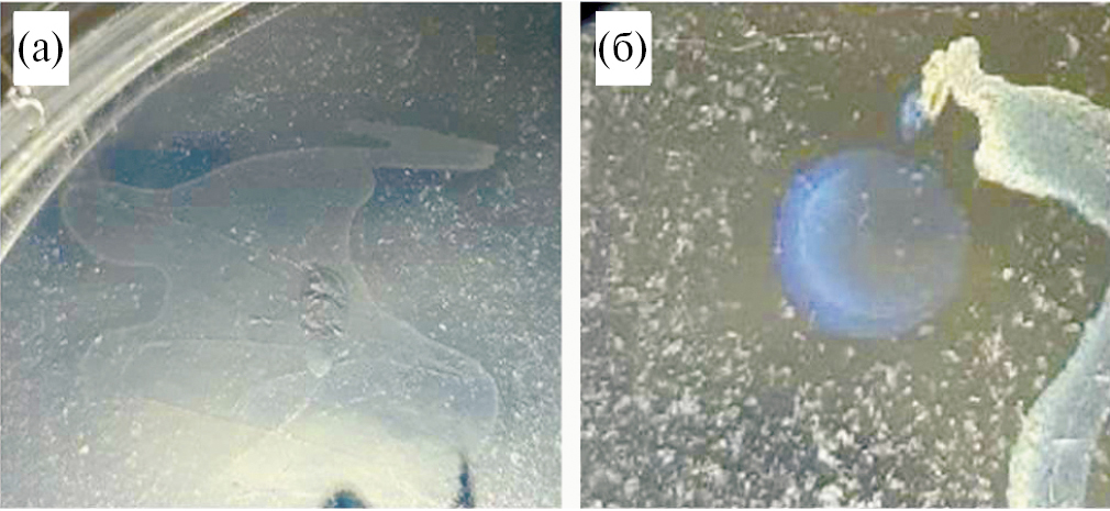 Клетки штамма M1, выделенные из накопительной культуры ME (инокулят — вода Кандалакшского залива), и P1, выделенный из накопительной культуры PE (инокулят — гомогенат червя Phyllodoce maculate), представляли собой палочки. Путем секвенирования и анализа генов 16S рРНК изоляты M1 и P1 были идентифицированы как штаммы Pseudoalteromonas undina с уровнем сходства с типовым штаммом 96.52 и 94.46% соответственно. При росте на твердой среде с хитином вокруг зоны роста образовывались свободные от хитина ореолы (рис. 4а). Штамм P1 был проверен на способность к росту на других полисахаридах и оказался способным расти за счет разложения ι- и ϰ-каррагинанов. Штамм P1 может являться новым видом рода Pseudoalteromonas.