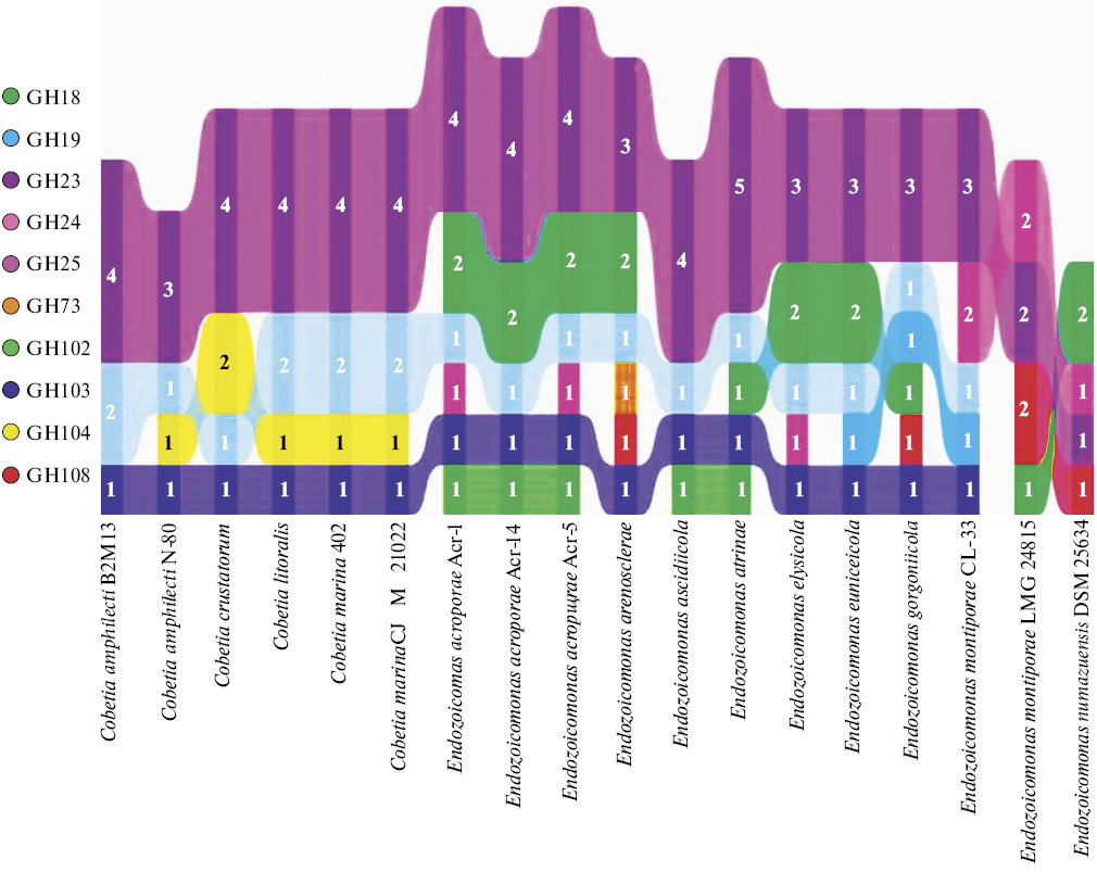 Гены, кодирующие ферменты семейств GH23 (в основном в него входят лизоцимы), GH73 (пептидогликан-гидролазы) и GH103 (пептидогликан-трансгликозилазы), были обнаружены почти во всех исследуемых геномах. В то же время ферменты из семейства GH104 (пептидогликан-гидролазы) были закодированы только в геномах представителей рода Cobetia, за исключением C. amphilecti B2M13. С другой стороны, гены белков семейств GH18 и GH19 (большинство охарактеризованных ферментов являются хитиназами), а также GH24, GH102 и GH108, были найдены только в геномах Endozoicomonas. Наборы данных генов различались как между разными видами, так и между разными штаммами одного вида. В геноме E. arenosclerae также был закодирован предполагаемый лизоцим из семейства GH25. Дополнительный поиск гомологов в SwissProt показал (см. Приложение), что для 16 отобранных генов ближайшим охарактеризованным гомологом являются хитиназы (у 12 генов семейства GH18) и хитодекстриназы (у 4 генов семейства GH18). Все эти гены были обнаружены в геномах представителей рода Endozoicomonas. Идентичность обнаруженных генов с их ближайшими охарактеризованными гомологами во всех случаях не превышала значения около 50%.