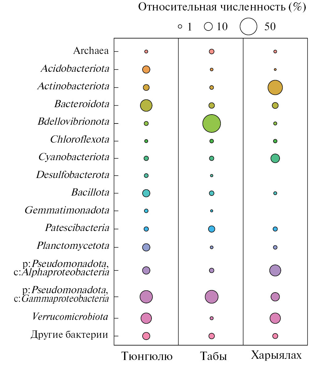 Озеро Харыялах было единственным из трех изученных, где была выявлена высокая представленность цианобактерий (фила Cyanobacteriota), среди которых преобладали одноклеточные (неидентифицированные представители семейства Prochlorococcaceae и представители родов Microcystis). В недавней работе по разнообразию и экологической характеристике цианобактерий и водорослей термокарстовых озер Якутии на основании многолетних морфологических наблюдений также отмечается преобладание одноклеточных цианобактерий (Kopyrina et al., 2020), но прямые сопоставления, к сожалению, невозможны.