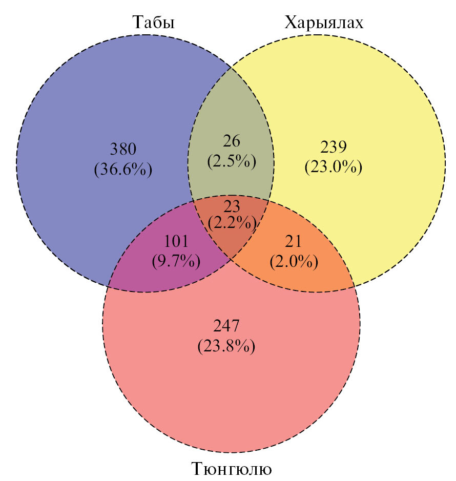 Анализ разнообразия фрагментов гена 16S рРНК показал, что во всех планктонных сообществах доминировали бактерии, в то время как археи составляли минорную часть (рис. 1). Диаграмма Венна показала большие отличия сообществ по составу микроорганизмов. Только 2.2% ОТЕ были общими в трех озерах (рис. 2). Индексы альфа-разнообразия указывают на то, что прокариотные сообщества оз. Тюгнюлю и Табы были более разнообразны, чем в оз. Харыялах (табл. 1).