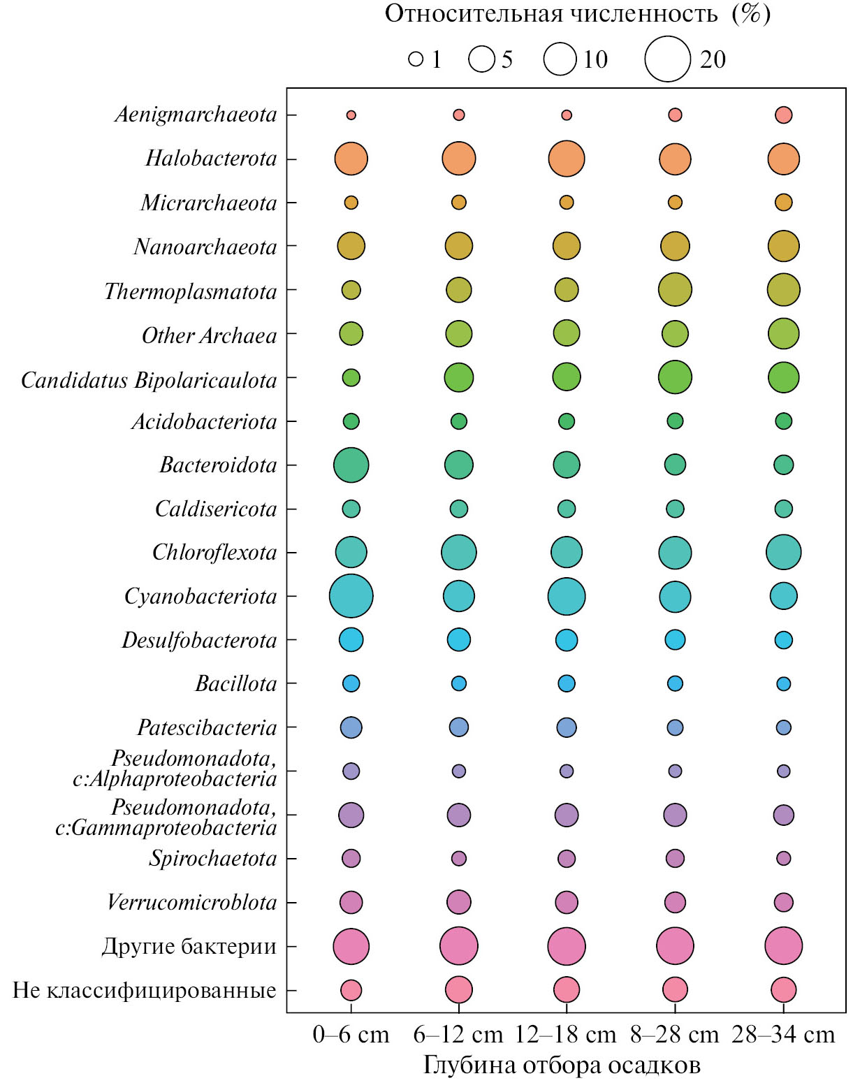 Придонные слои воды и осадки озера Черный Кичиер представляют собой анаэробные местообитания. Во всех слоях осадка было обнаружено достаточно большое количество цианобактерий, которые, скорее всего, представляют мортмассу (mortmass), осевшую из верхних слоев водной толщи. Кроме цианобактерий, в осадках были представлены филы Bacteroidota, Chloroflexota, Desulfobacterota и Verrucomicrobiota. Среди бактерий преобладали гетеротрофные бактерии класса Gammaproteobacteria (22.2%), а также филумов Verrucomicrobiota (16.4%) и Bacteroidota (21.5%) (рис. 1). Среди архей доминировали гидрогенотрофные и ацетокластические метаногены филума Halobacterota. Некультивируемые археи были представлены филами Aenigmarchaeota, Nanoarchaeota, Micrarchaeota и Thermoplasmatota.