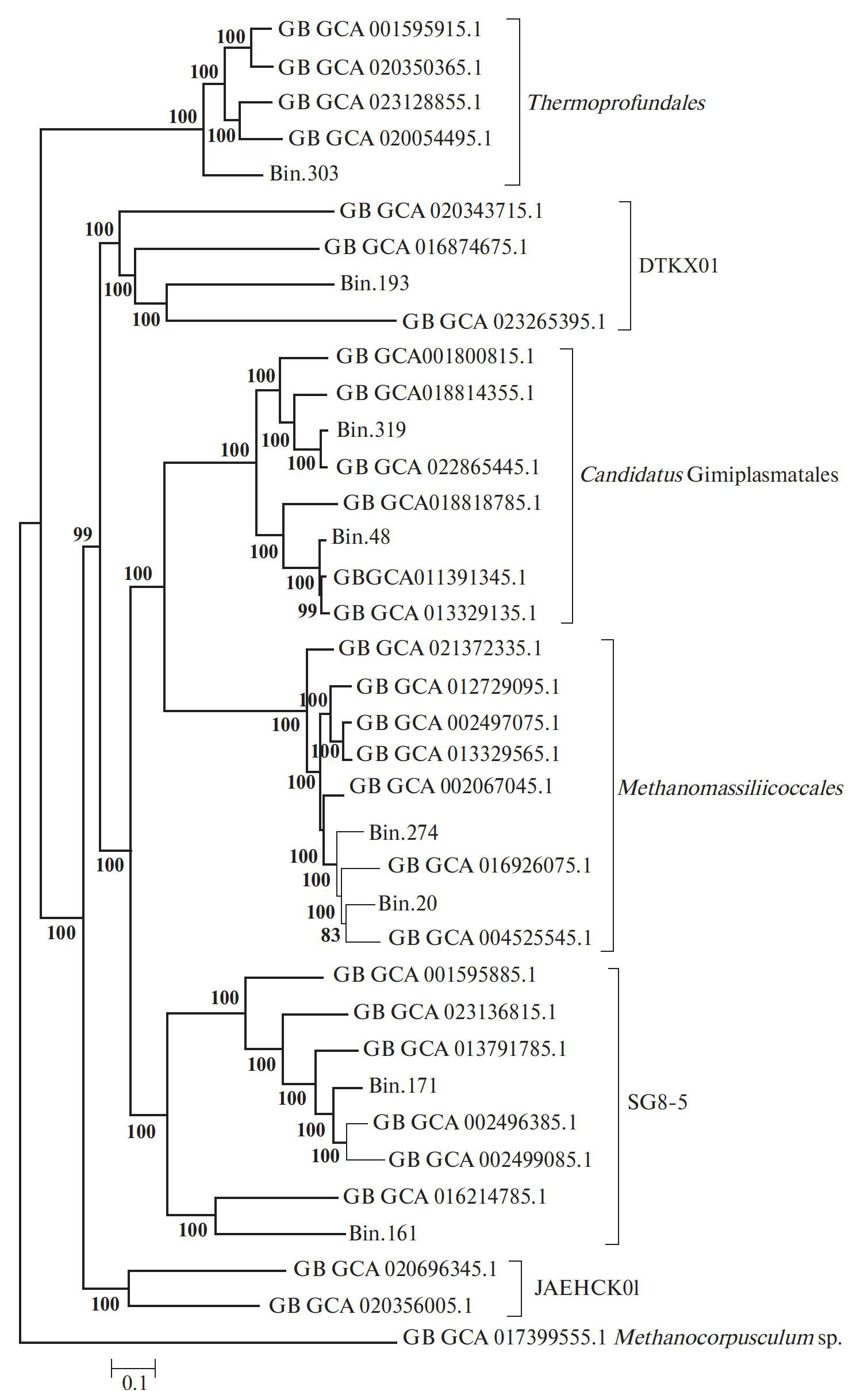Филум Thermoplasmatota был представлен группой MBGD, которая с глубиной увеличивала свою долю (рис. 1). Для получения геномов представителей микробного сообщества мы просеквенировали метагеном образца осадка с глубины 28‒34 см. Собранные контиги были кластеризованы в 47 MAGs, имеющих полноту свыше 80% и загрязнение менее 10% по оценке CheckM на основе анализа присутствия набора консервативных однокопийных маркерных генов. Таксономическая классификация MAG выявила те же самые основные архейные и бактериальные филумы, которые были обнаружены с помощью 16S рРНК. Чтобы получить представление о метаболических возможностях основных представителей филума Thermoplasmatota, мы подробно проанализировали 8 MAGs. Все они имели полноту более 85% и составляли 2.1% от всего метагенома (контиги более 1500 нт). Эти MAGs были отнесены к 5 порядкам — Methanomassiliicoccales, Thermoprofundales (в прошлом называемых Marine Benthic Group D и DHVEG-1), DTX01, SG8-5 и “Candidatus Gimiplasmatales” (бывший UBA10834) (рис. 2) (Hu et al., 2021; Zheng et al., 2022).