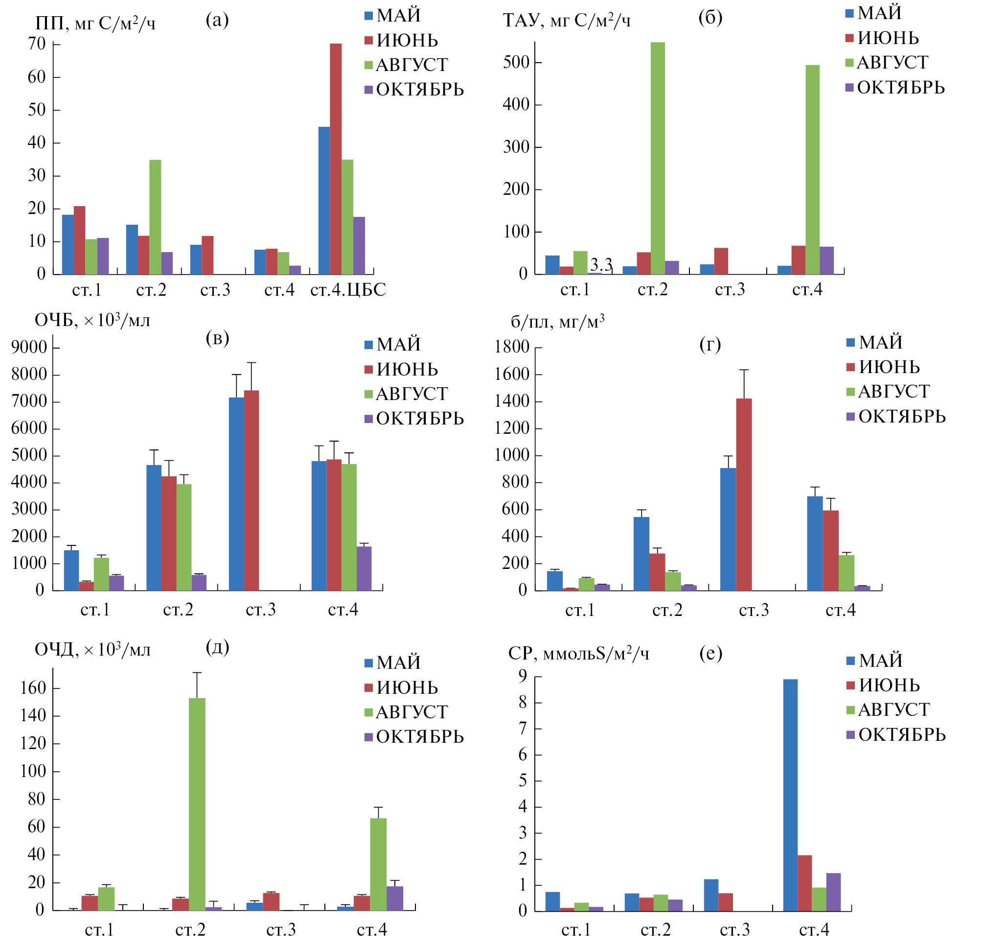 Расчеты показали, что суммарная продукция планктонным сообществом ОВ под 1 м2 варьировала в широком диапазоне от 0.66 до 31.4 мг С/м2/ч. Можно отметить, что в каждом месяце максимальные величины проявлялись на разных станциях: в мае на ст. 1 — 25.7 мг С/м2/ч, в июне на ст. 2 — 31.4 мг С/м2/ч, в августе на ст. 3 — 28.1 мг С/м2/ч. В бентосном сообществе величины варьировали от 21.2‒33 мг С/м2/ч в июне/октябре до 54.2‒54.5 мг С/м2/ч в мае/августе (рис. 1а; табл. 2).