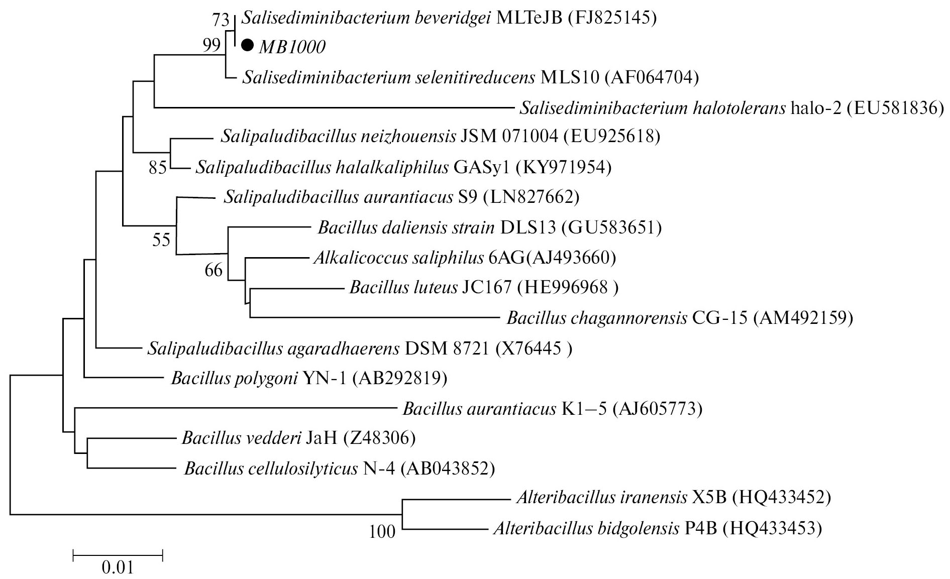 Клетки выделенного штамма MB1000 подвижные, имеют палочковидную форму (0.5‒0.6 × × 2.3‒2.7 мкм), в присутствии хромата в среде образуют биопленку. Проведенный филогенетический анализ показал, что штамм MB1000 относится к роду Salisediminibacterium семейства Bacillaceae. Согласно результатам сравнения нуклеотидной последовательности гена 16S рРНК с базой данных NCBI Blast, наибольший уровень сходства на основании нуклеотидной последовательности гена 16S рРНК установлен с Salisediminibacterium beveridgei (сходство нуклеотидной последовательности 99.46%) (Baesman et al., 2009) и Salisediminibacterium selenitireducens 98.71% (Blum et al., 1998) (рис. 1).
