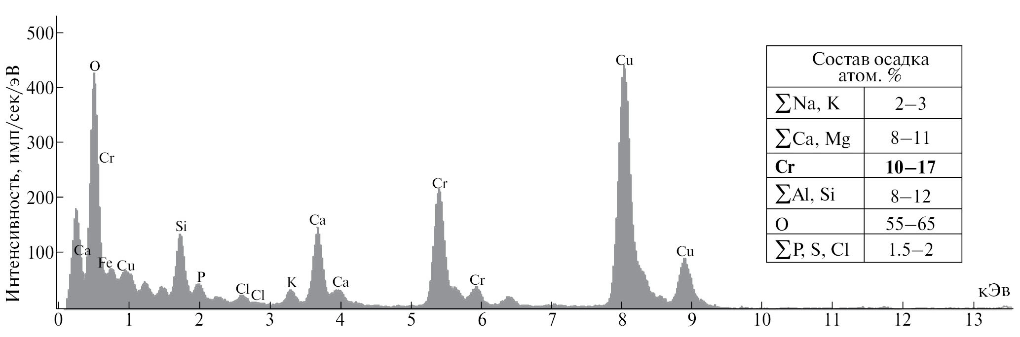 В процессе культивирования штамма MB1000 на средах с хромом на дне пенициллиновых флаконов накапливается органоминеральный осадок серо-фиолетового цвета. Последовательное 4-х кратное низкоскоростное центрифугирование (200 g, 5‒10 с) позволяет частично разделить осадок на компоненты: биомассу (остающуюся во взвешенном состоянии) и минеральный осадок. Результаты рентгеновского микроанализа показывают значительное содержание хрома в минеральной фракции осадка (рис 2.).