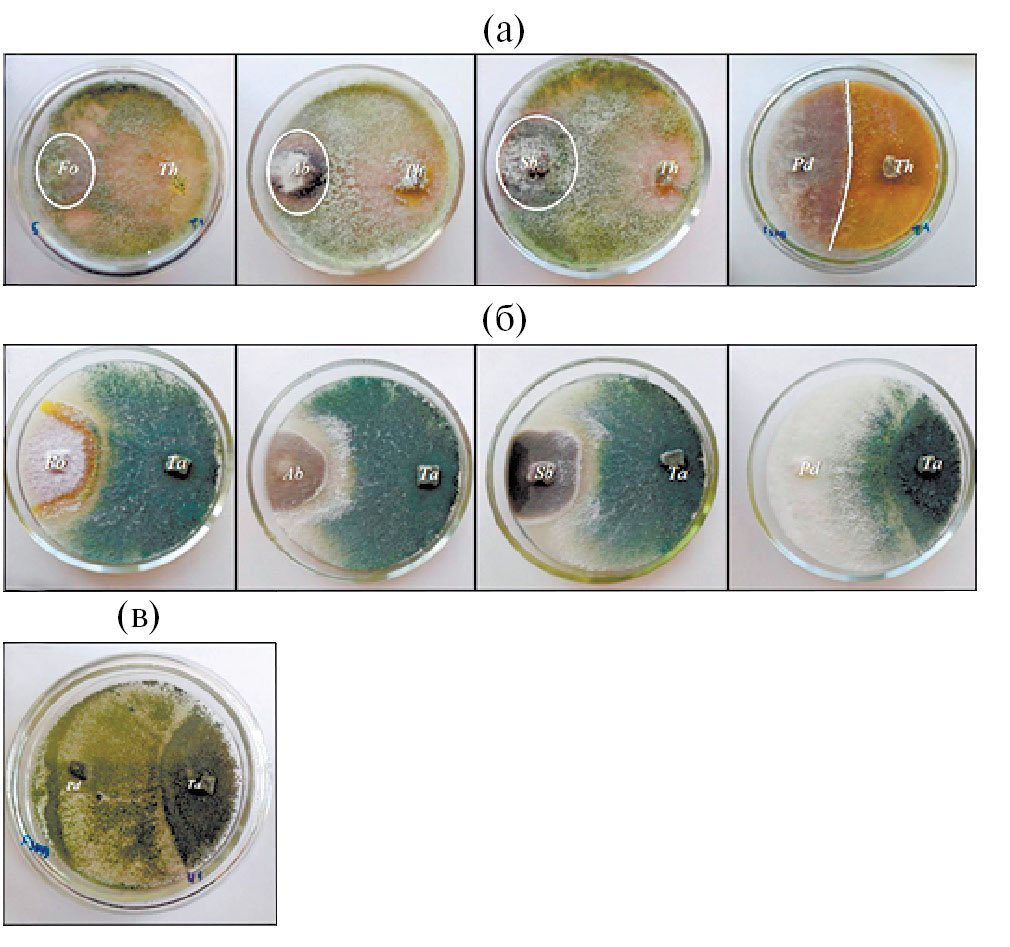 Рис. 3. Антагонизм in vitro: ряд (а) справа (Th) Trichoderma harzianum; ряд (б) справа (Ta) Trichoderma atroviride, фитопатогены слева (Fo) Fusarium (orthoceras) oxysporum, (Ab) Alternaria botrytis, (Sb) Stemphylium botryosum, (Pd) Phytophthora drechsleri (возраст культур 7 сут); ряд (в) (Pd) Phytophthora drechsleri и (Ta) Trichoderma atroviride. Возраст культур 14 сут.