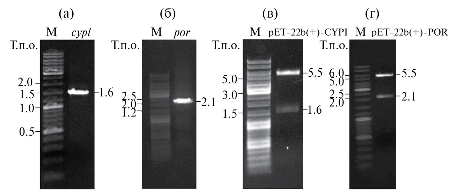 ПЦР-продукты генов CYPI и POR были по отдельности клонированы в плазмидный экспрессионный вектор pET-22b(+) под контроль Т7 промотора. Полученные лигазные смеси использовали для трансформации компетентных клеток E. сoli DH5α с последующим отбором положительных трансформантов на агаризованной среде LB, содержащей 100 мкг/мл ампициллина. Наличие вставок целевых генов в рекомбинантных плазмидах выделенных из выборочных положительных трансформантов подтверждали экспресс-ПЦР-реакцией с использованием ген-специфических праймеров, а также рестрикционным анализом (рис. 1в, 1г).