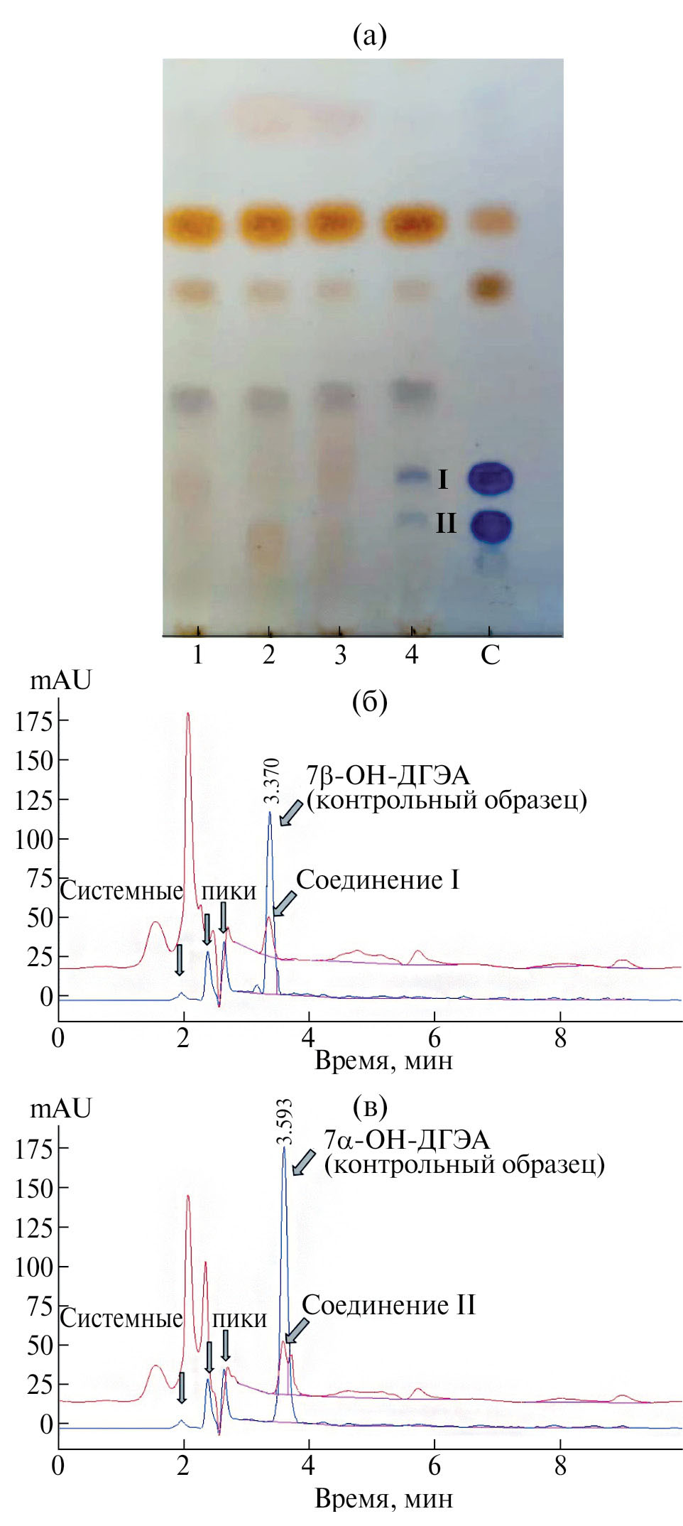 Соединения I и II были выделены и на основании сопоставления с аутентичными гидроксистероидами были идентифицированы как 7β-ОН-ДГЭА и 7α-ОН-ДГЭА, соответственно (рис. 2б, 2в).