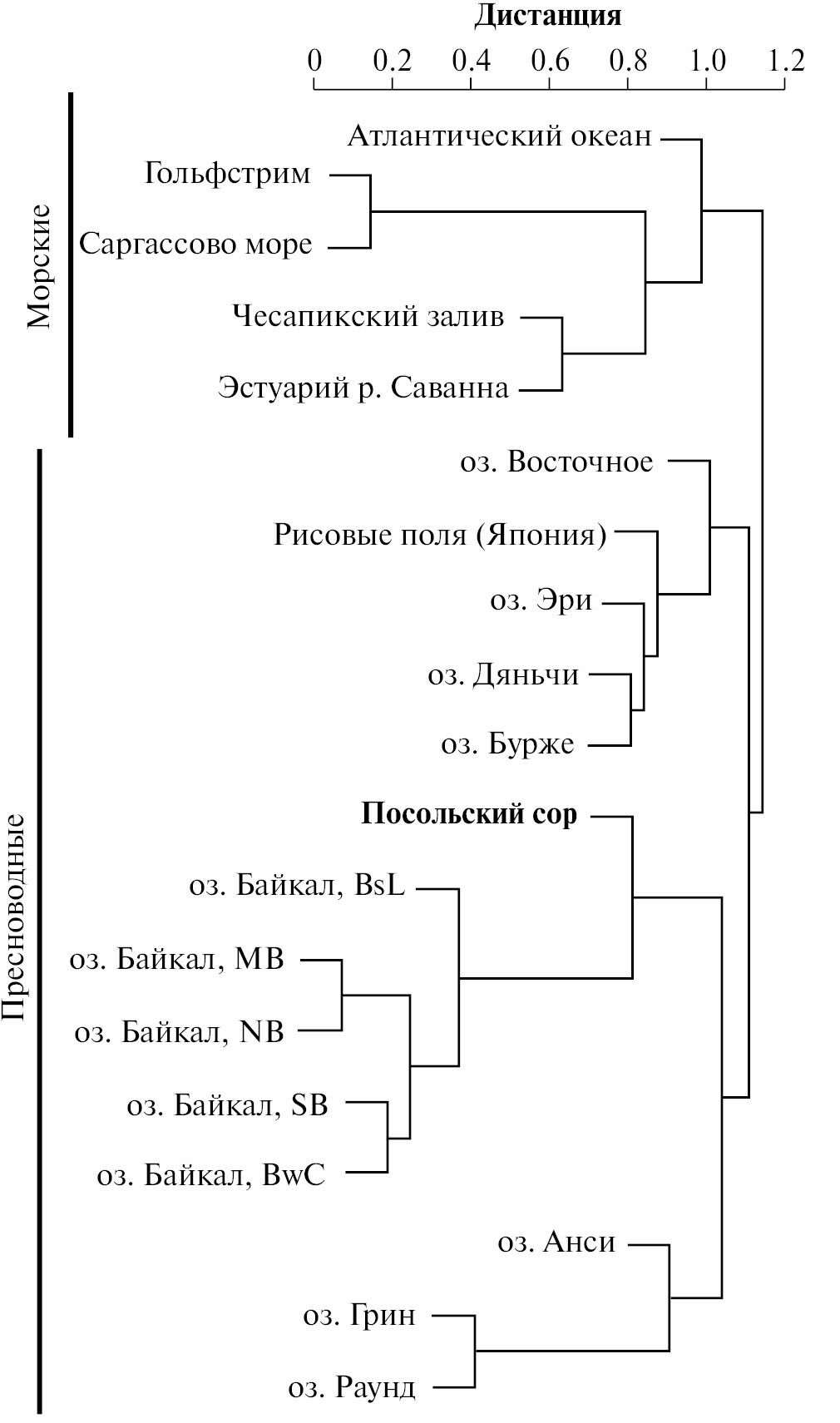 Методом UPGMA продемонстрировано, что распределение вирусов связано со средой обитания. Морские и пресноводные вирусы обычно не являются генетически близкими и группируются в обособленные филогенетические кластеры, как и следует из выполненного нами анализа. Последовательности из планктона залива Посольский сор сформировали общий кластер вместе с последовательностями, ранее полученными из различных экотопов оз. Байкал, включая эндемичные губки. Последовательности из оз. Байкал вошли в совместный кластер с таковыми из оз. Грин (США), Раунд (США) и Анси (Франция). Последовательности из озер Восточное (Китай), Дяньчи (Китай), Бурже (Франция) и Эри (США), вместе с последовательностями из рисовых полей (Япония), образовали отдельный кластер. Также, показано, что все байкальские последовательности группируются в общий кластер (рис. 1).