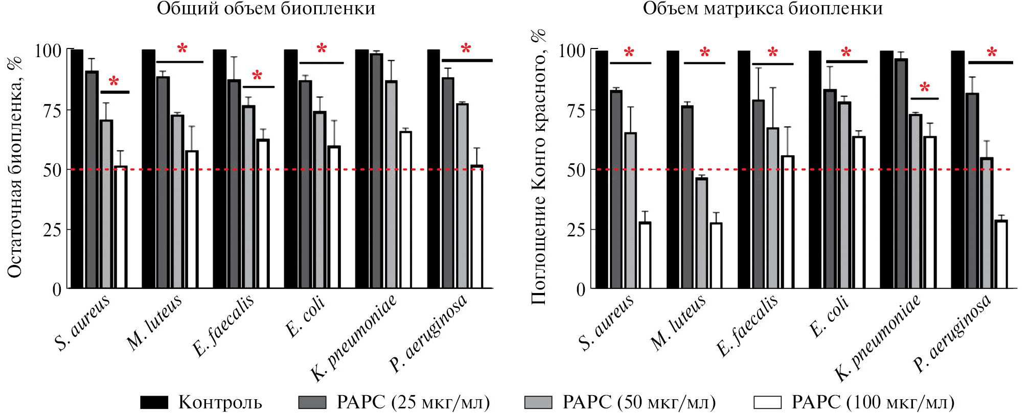 Большинство биопленок продуцируют внеклеточный матрикс, включающий белки в амилоидной форме, который способствует поддержанию стабильности биопленки (Taglialegna et al., 2016). Чтобы проанализировать гидролиз амилоидов матрикса биопленки протеазой PAPC, мы проводили окрашивание нативных и обработанных ферментом биопленок Конго красным. После обработки протеазой PAPC содержание амилоидных компонентов матрикса биопленок всех шести штаммов было ниже, чем в необработанных пробах. Наибольшее снижение содержания амилоидов после обработки протеазой PAPC в концентрации 100 мкг/мл (остаточное содержание менее 30%) наблюдалось в биопленках бактерий S. aureus, M. luteus и P. aeruginosa (рис. 1).