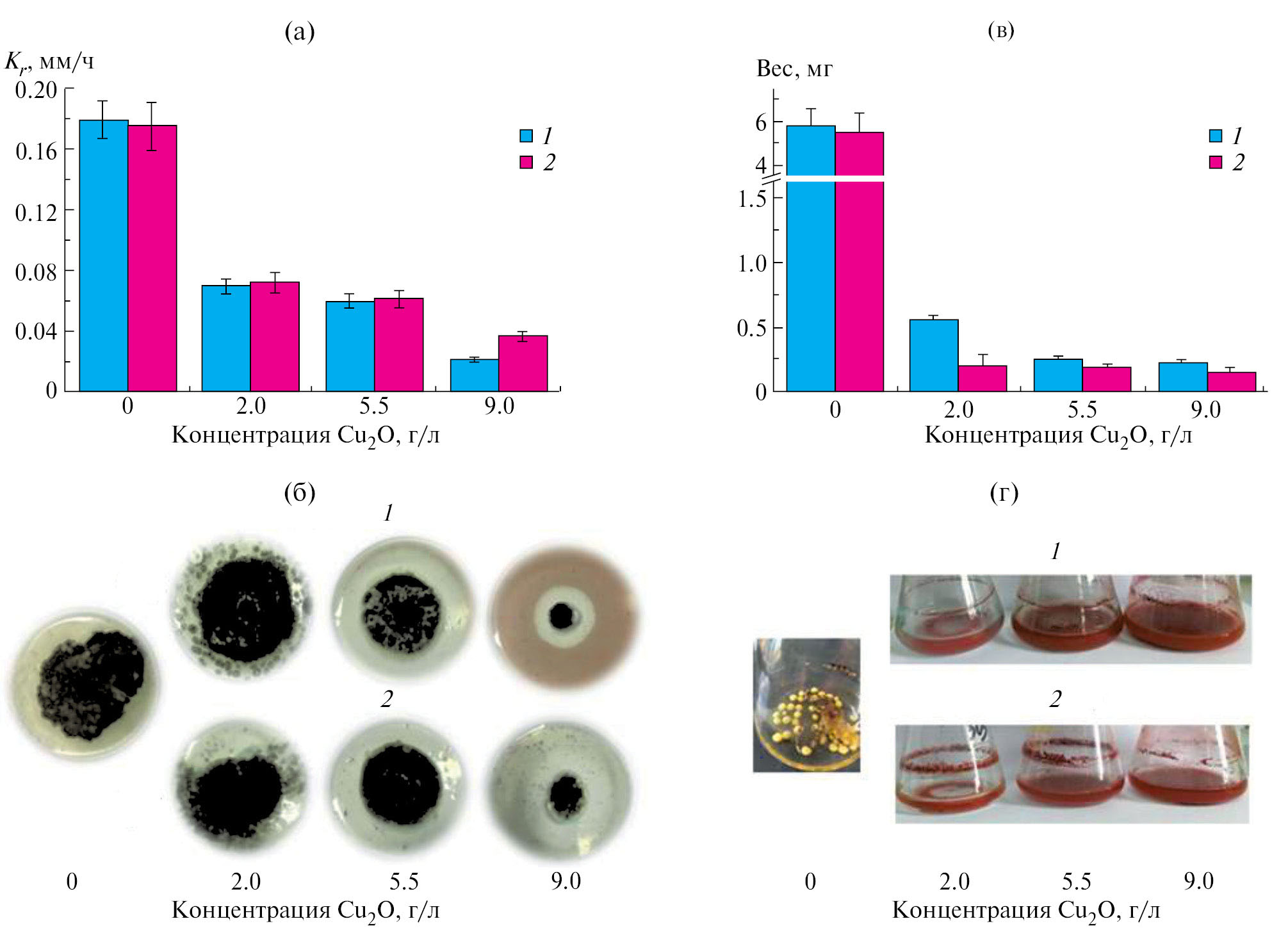 Рис. 2. Токсическое действие некапсулированных (1) и капсулированных (2) частиц Cu2O в отношении A. niger: а — средняя радиальная скорость роста на агаризованной среде Чапека–Докса; б — рост A. niger на агаризованной среде Чапека–Докса с различными концентрациями Cu2O; в-величина биомассы при росте микромицета в жидкой среде Чапека–Докса; г — рост A. niger в жидкой среде Чапека–Докса с различными концентрациями Cu2O.