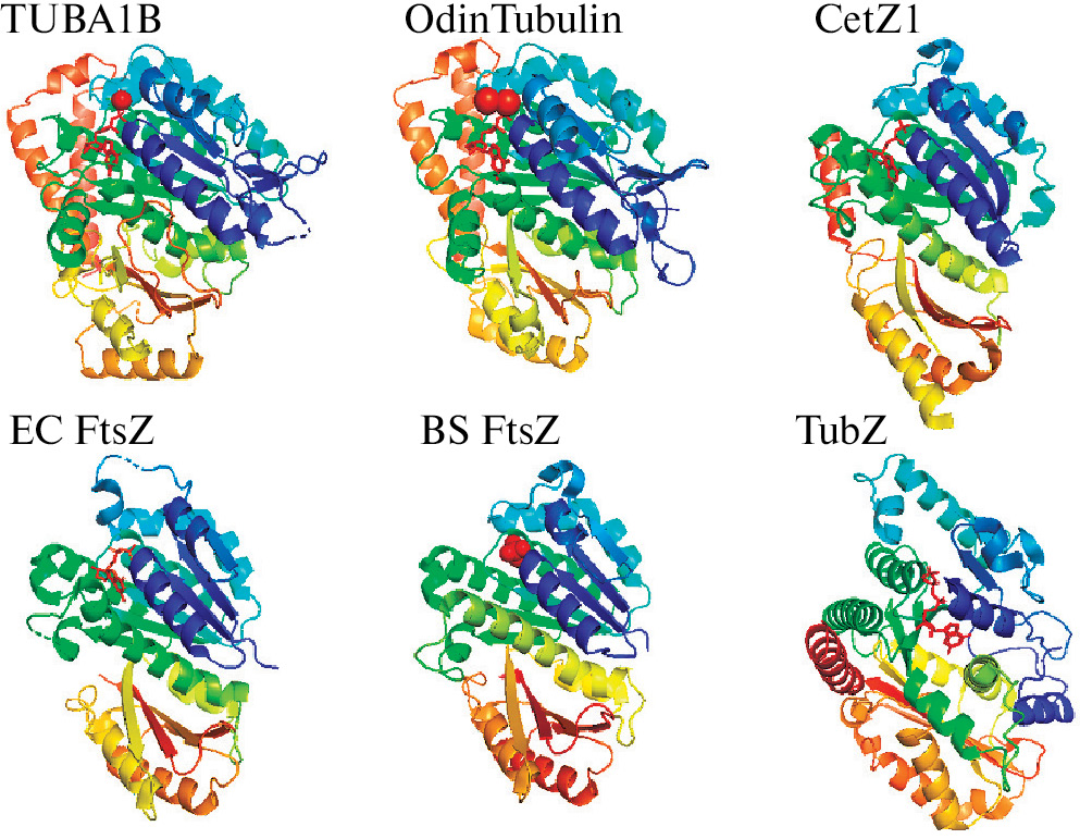 Рис. 2. Трехмерные структуры белков-гомологов тубулина в комплексе с нуклеотидом (ГТФ или ГДФ, обозначен красным). TUBA1B — α-тубулин человека типа 1B (идентификатор PDB: 7pjf); OdinTubulin — белок асгардархей OdinTubulin из Candidatus Odinarchaeum yellowstonii (идентификатор PDB: 7EVB); CetZ1 — белок CetZ1 архей Haloferax volcanii (идентификатор PDB: 4b46); EC FtsZ — белок FtsZ E. coli (идентификатор PDB: 6UNX); BS FtsZ — белок FtsZ B. subtilis (идентификатор PDB: 2vam); TubZ — белок TubZ Bacillus thuringiensis (идентификатор PDB: 3m89). Цветовая кодировка соответствует положению в аминокислотной последовательности: синий цвет — N-конец, красный — С-конец
