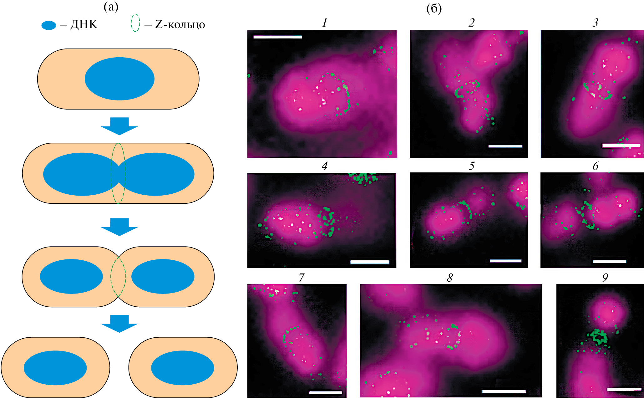 Рис. 3. Роль белка FtsZ в делении бактериальной клетки. Слева — схема бинарного деления бактерий: после репликации ДНК (синие овалы) посередине клетки образуется Z-кольцо (зеленая линия), которое в процессе деления постепенно сужается. Справа — визуализация Z-кольца во время цитокинеза при помощи сверхразрешающей микроскопии; микрофотографии, обозначенные цифрами от 1 до 9, упорядочены приблизительно в порядке сокращения Z-кольца. Фиолетовым отмечена ДНК, зеленым — FtsZ (цитировано по Vedyaykin et al., 2016)