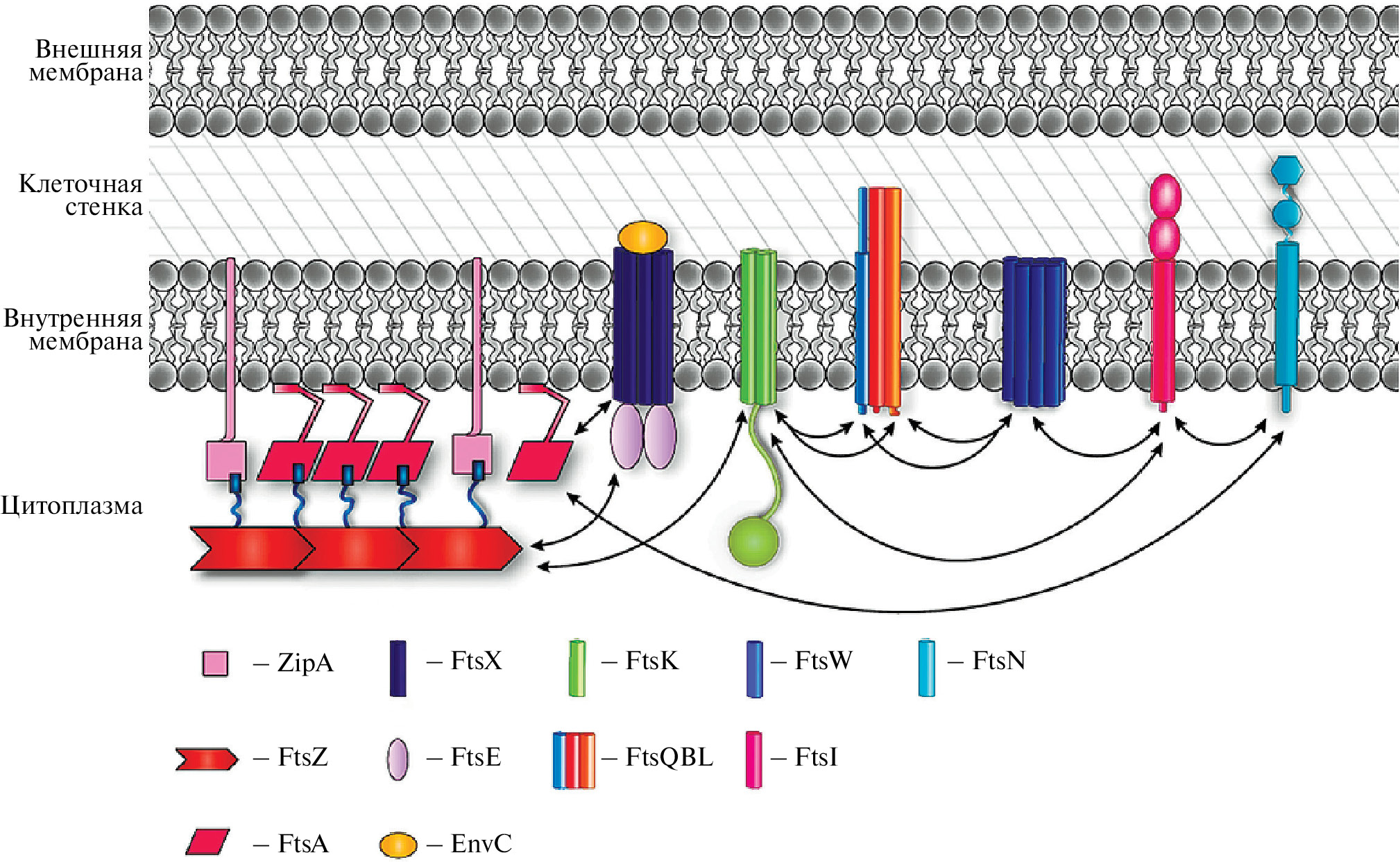 Для осуществления клеточного деления в состав дивисомы привлекается множество других белков, которые взаимодействуют с FtsZ, прикрепляя Z-кольцо к мембране, и выполняют другие функции. Идентифицировано в общей сложности более 35 белков, участвующих в клеточном делении E. coli (Du, Lutkenhaus, 2017). Как показано для двух модельных организмов, B. subtilis и E. coli, сборка дивисомы может быть разделена на две последовательные стадии. На первой стадии с участием ранних белков клеточного деления на внутренней стороне цитоплазматической мембраны образуется Z-кольцо. Эти белки важны для связывания полимеров FtsZ с мембраной или выполняют другие регуляторные функции во время созревания Z-кольца. Ранние белки включают гомолог тубулина FtsZ и его мембранные якоря FtsA и ZipA, которые образуют так называемое прото-кольцо вместе с несколькими белками, ассоциированными с Z-кольцом (ZapA-G). На второй стадии поздние белки клеточного деления, включая ферменты, вовлеченные в синтез пептидогликана, привлекаются в место будущего деления, что обеспечивает синтез септального пептидогликана и, наконец, цитокинез. Белковый комплекс ABC-транспортер FtsEX следует за ранними белками и, вероятно, участвует в дальнейшей сборке дивисомы. К поздним белкам относятся ДНК-транслоказа FtsK, а также FtsQ, FtsBL, FtsWI и FtsN и другие белки (Attaibi, den Blaauwen, 2022). Основные белки дивисомы E. coli изображены на рис. 4.