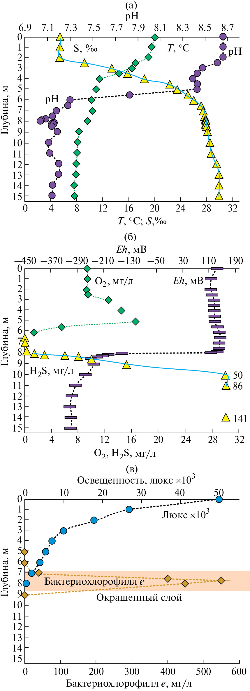Рис. 2. Основные физико-химические характеристики водной толщи оз. Могильное (июль 2018 г.): a — S — соленость,‰; рН; Т — температура, °C; б — cодержание кислорода (О2), сероводорода (H2S) и величина окислительно-восстановительного потенциала (Eh); в — величина освещенности (люкс), концентрация бактериохлорофилла е и положение окрашенной бактериальной пластины в водной толще оз. Могильное (Krasnova et al., 2019; Жильцова и соавт., 2019)