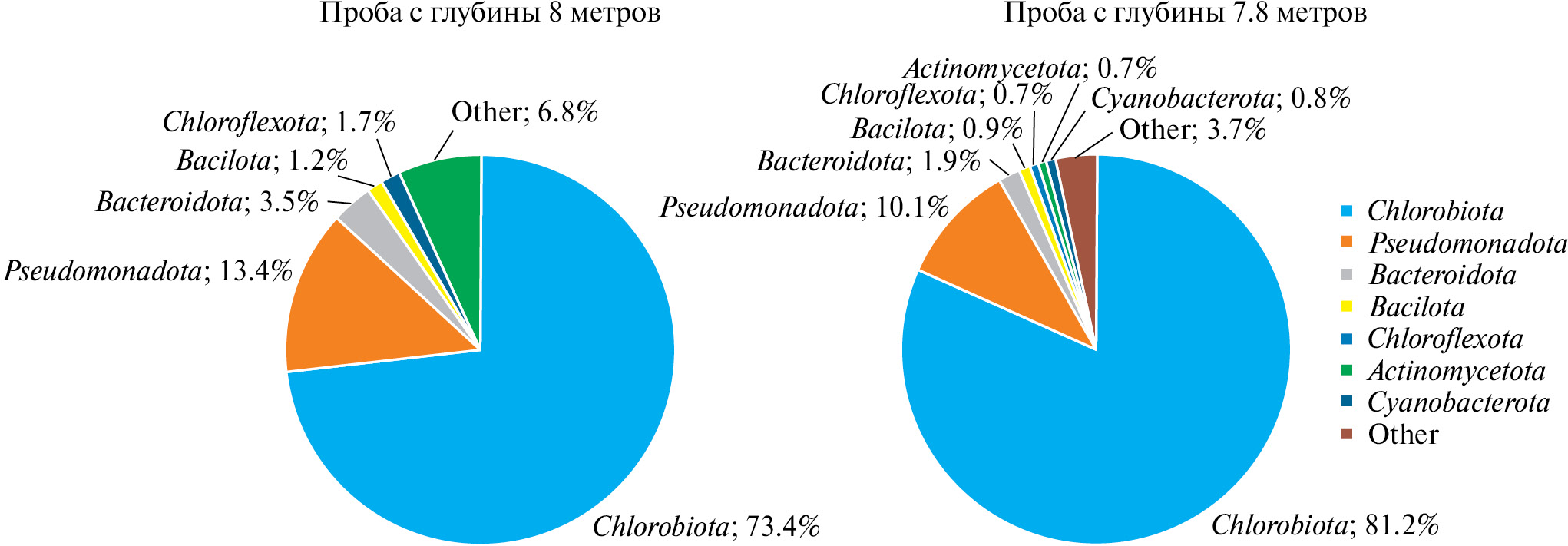 Рис. 3. Таксономический состав бактерий зоны хемоклина двух близко расположенных горизонтов (7.8 и 8.0 м) по данным метагеномного анализа. Пояснения на рисунке