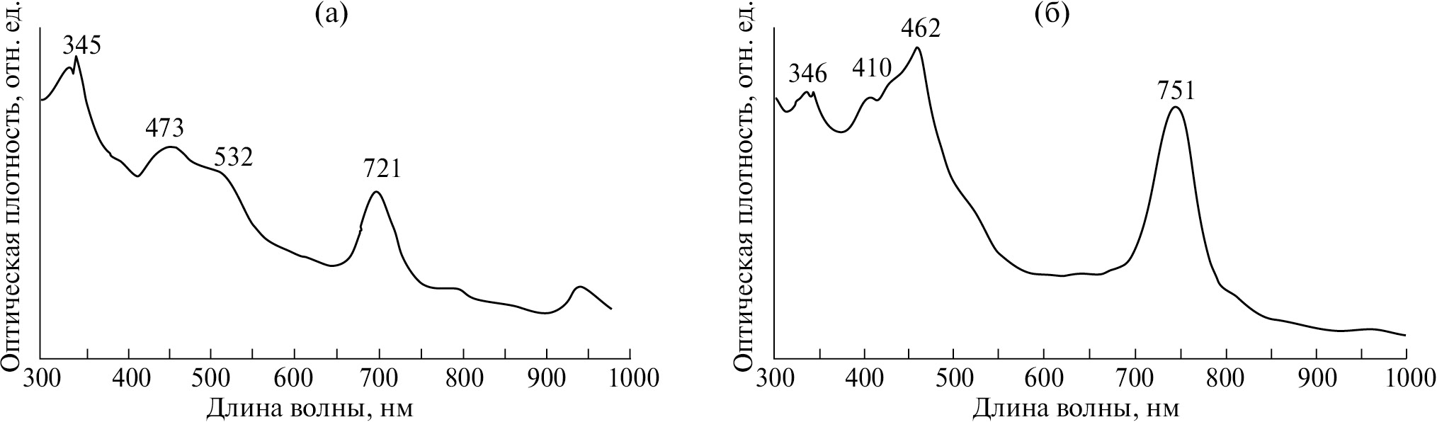 Рис. 4. Спектры поглощения клеток коричневого морфотипа Ptc. aestuarii, штамм Mog18–2, обнаруженного в оз. Могильном (а), содержащего бактериохлорофилл e (максимум 721 нм.), (ранее назван Ptc. phaeoasteroidea (Пучкова, Горленко, 1976)) и зеленого Prosthecochloris, штамм Mog18–3 (б), содержащего бактериохлорофилл с (максимум 751 нм)
