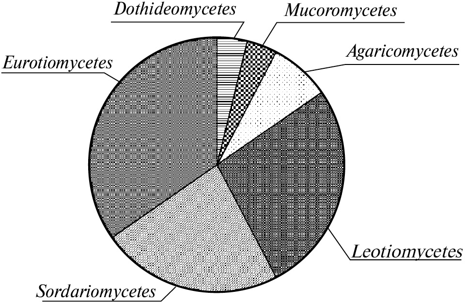 Идентификация выделенных грибов проводилась на основании фенотипических и генотипических признаков. Все выделенные грибы были отнесены к 26 таксонам, которые принадлежат 7 классам грибов (табл. 3, рис. 1).