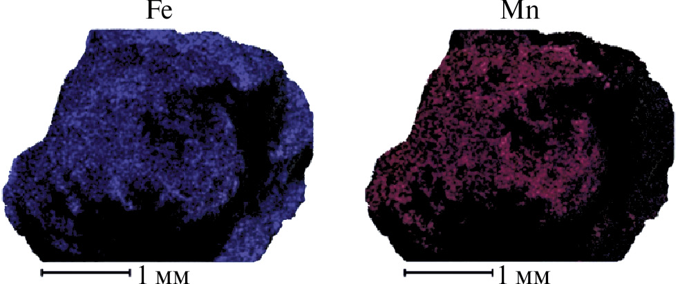 В отличие от почвенного мелкозема, MnOM идентифицированы в ЖМО, сформированных не только в верхней, но и в нижней части профиля (до глубины 140 см). Отсутствие культивируемых форм MnOM во вмещающем почвенном мелкоземе и их наличие в ЖМО в одних и тех же горизонтах позволяет предположить проявление кратковременных окислительно-восстановительных периодов, в которые MnOM попадают в нижележащие горизонты (преимущественно с гравитационным током почвенного раствора) и образуют микрозоны. Такие микрозоны могут являться первичным ядром для образования ЖМО. В отдельных исследованиях подобные образования идентифицируют как “прото-конкреции” (Dabard, Loi, 2012). Широко исследованная способность отдельных групп почвенных микроорганизмов к окислению Mn(II) и осаждению (гидр)оксидов Mn на поверхности клеток способствует образованию микросферических агрегатов, что в последующем, возможно, приводит к формированию ЖМО. Данное предположение может подтверждаться спецификой распределения Fe и Mn внутри ЖМО. В изученных образцах ЖМО всех размеров четко идентифицировано ядро (внутренняя зона ортштейнов), обогащенное ионами Mn (рис. 3).