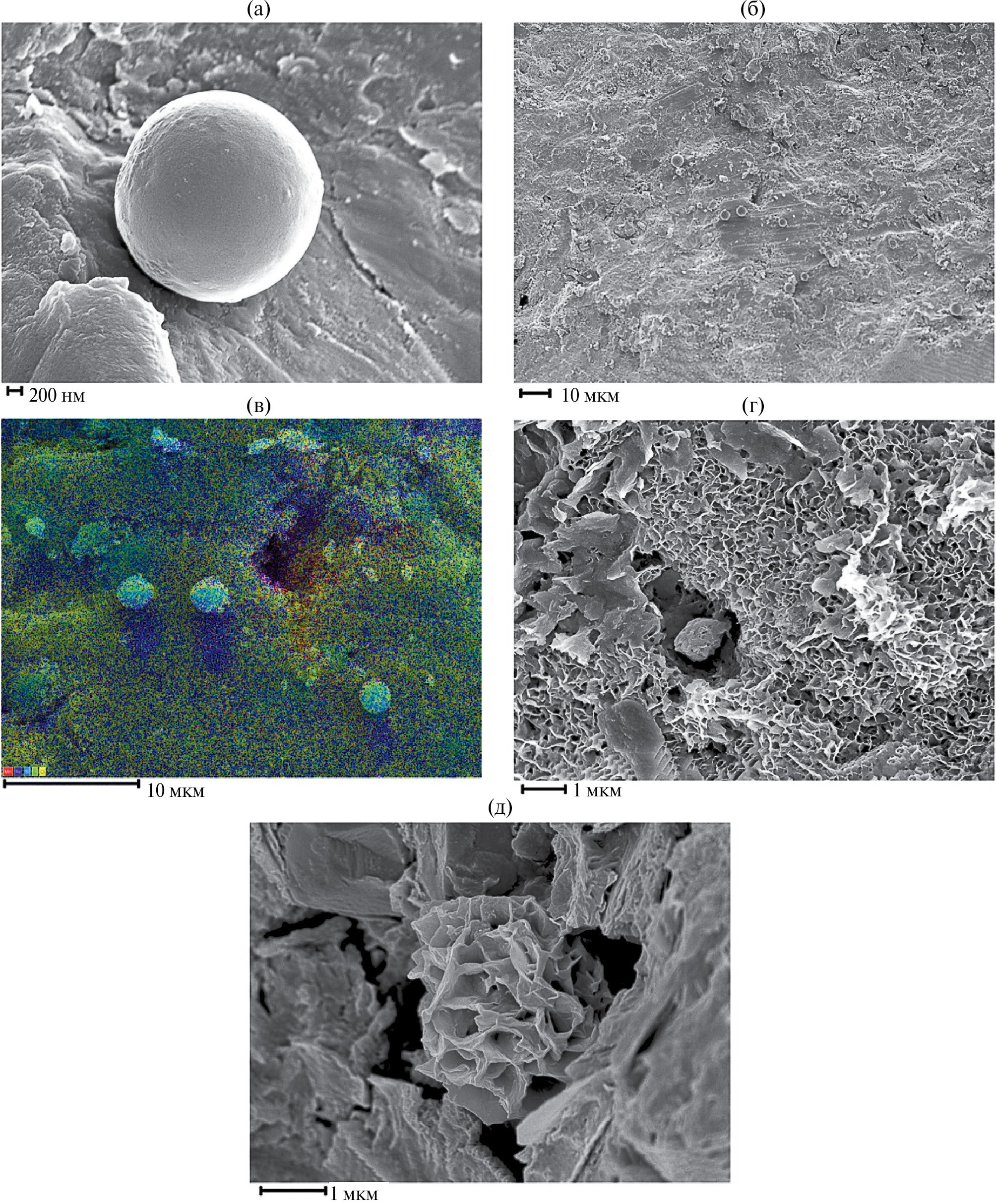 Рис. 4. Структуры в ортштейнах: а — сферула во внутренней зоне ортштейнов; б — группа сферул на поверхности ортштейна; в — элементный состав сферул; г — гликокаликс; д — “nanoflowers” (наноцветы)