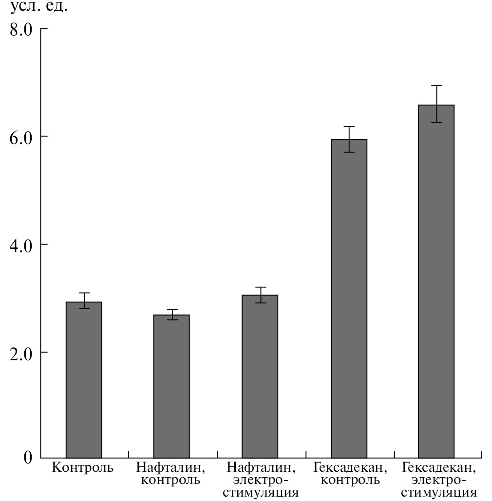 Для оценки влияния биоэлектрохимической стимуляции на относительную представленность (Taylor et al., 2010) генов, ответственных за начальные стадии деградации алканов, был проведен аналогичный эксперимент, где в донные отложения были искусственно внесены типичные индивидуальные алифатические и ароматические углеводороды, присутствующие в нефти: н-гексадекан и нафталин. С использованием вырожденных праймеров (Powell et al., 2006) в тотальной ДНК, выделенной из донных отложений после двухмесячной инкубации, оценивали относительную представленность (относительное число копий) гена alkB, используя в качестве гена сравнения 16s рРНК (рис. 4).