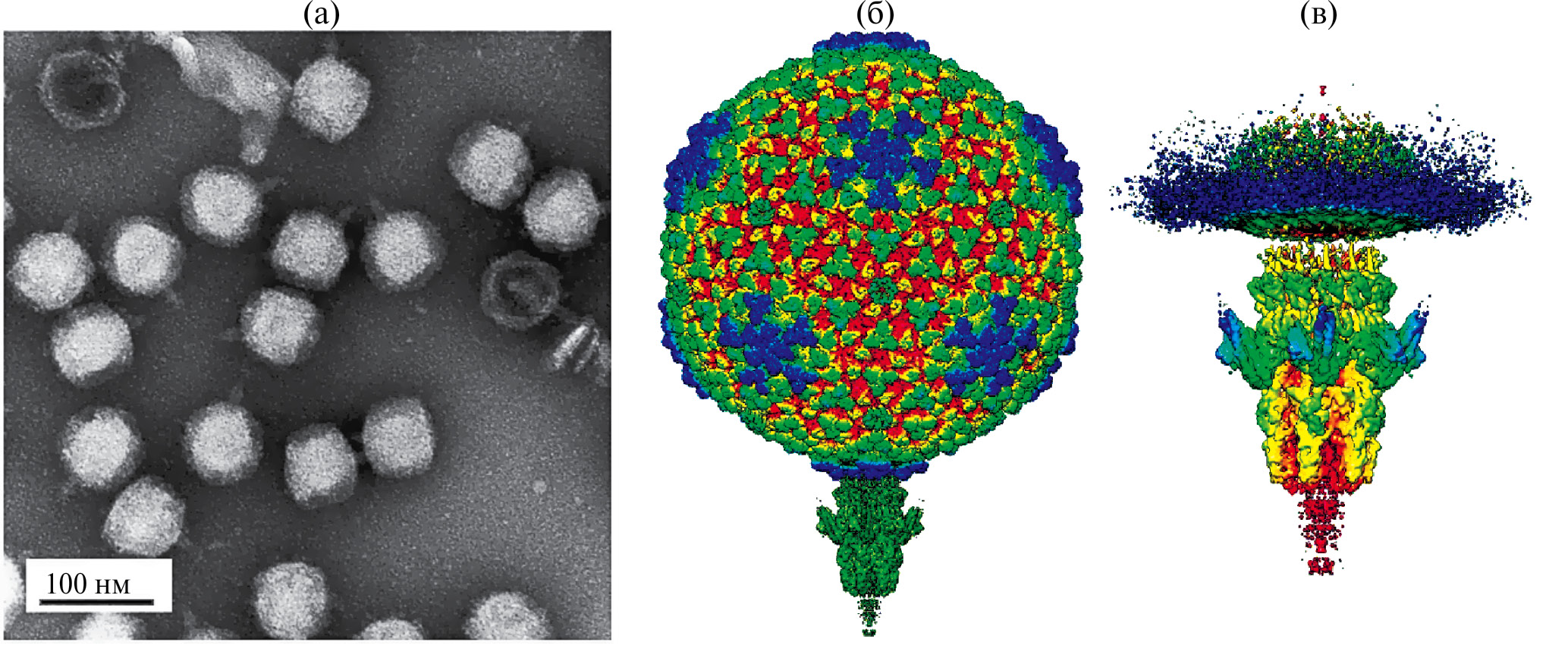 Рис. 1. Структурные особенности бактериофага ϕ24B: a – изображение вирионов, полученное при помощи ПЭМ; б – трехмерная реконструкция целого вириона; в – трехмерная реконструкция хвоста (градиент цвета от красного к синему отражает расстояние от центральной оси хвоста)