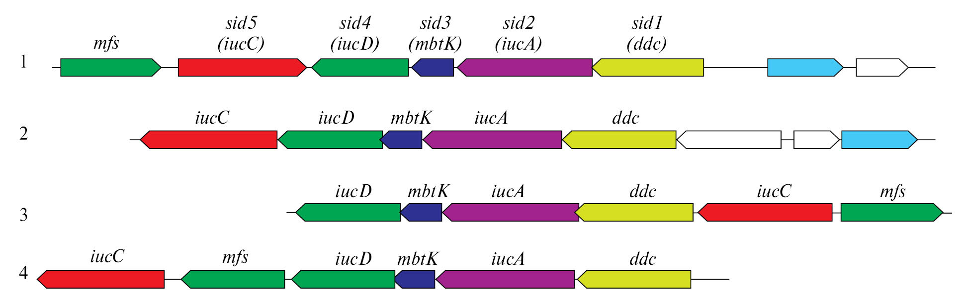 В локусе 1 гены sid1–4, по всей видимости, образуют оперон, а ген sid5 транскрибируется во встречном направлении. Такая организация является уникальной для плазмиды pSID, т.к. у известных бактерий ген sid5 (iucC) транскрибируется в том же направлении и находится либо в начале, либо в конце оперона (рис. 2).