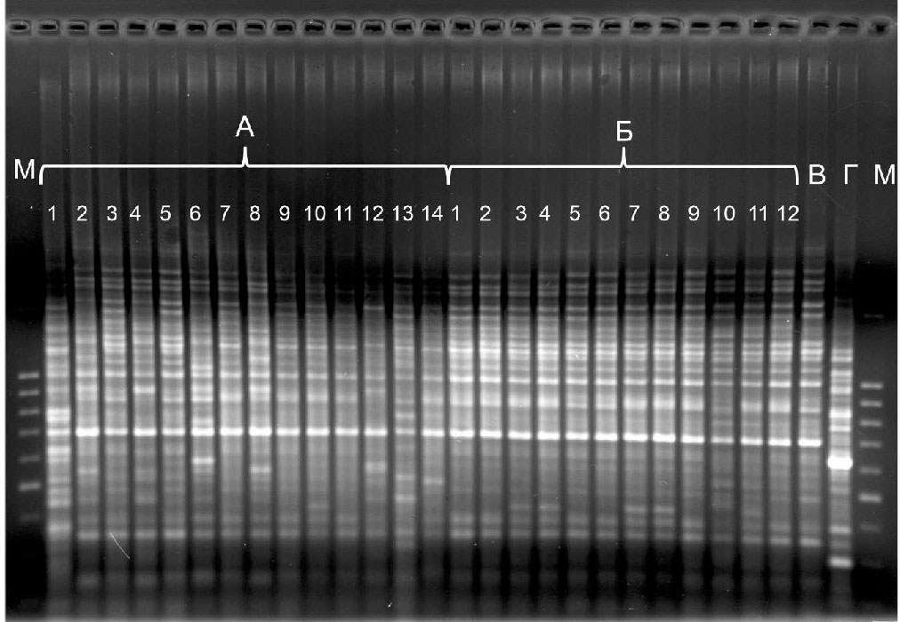 Рис. 3. Фореграмма RAPD-профилей изолятов ризобий, выделенных из клубеньков фасоли обыкновенной с использованием праймера AFK-1. А ‒ профили изолятов, полученных из клубеньков растения, выращенного на почве, инокулированной штаммом R. leguminosarum Pvu2 после 30-дневной инкубации; Б ‒ профили изолятов, полученных из клубеньков растения, выращенного в корневой системе гороха посевного на почве, инокулированной штаммом R. leguminosarum Pvu2; В – профиль штамма Pvu2; Г – профиль штамма St4; М – 100 п.н. маркер.